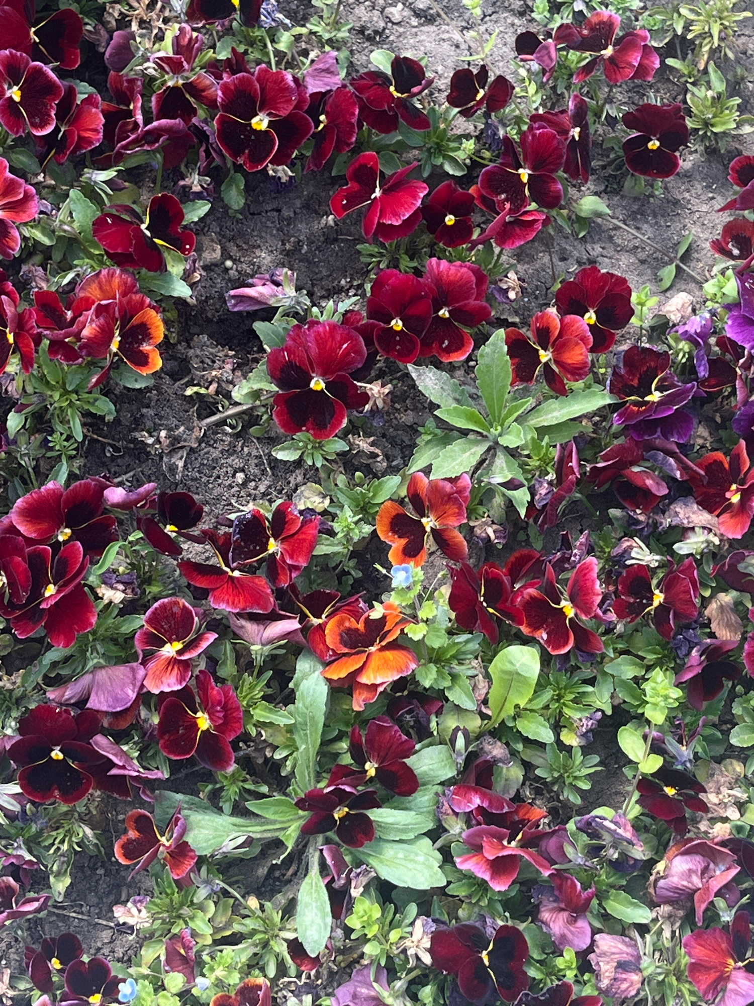The image shows a close-up view of a flower bed in Plovdiv, Bulgaria. The bed is filled with pansies, predominantly in shades of deep red and burgundy, with a few exhibiting orange and purple hues. Th…read more