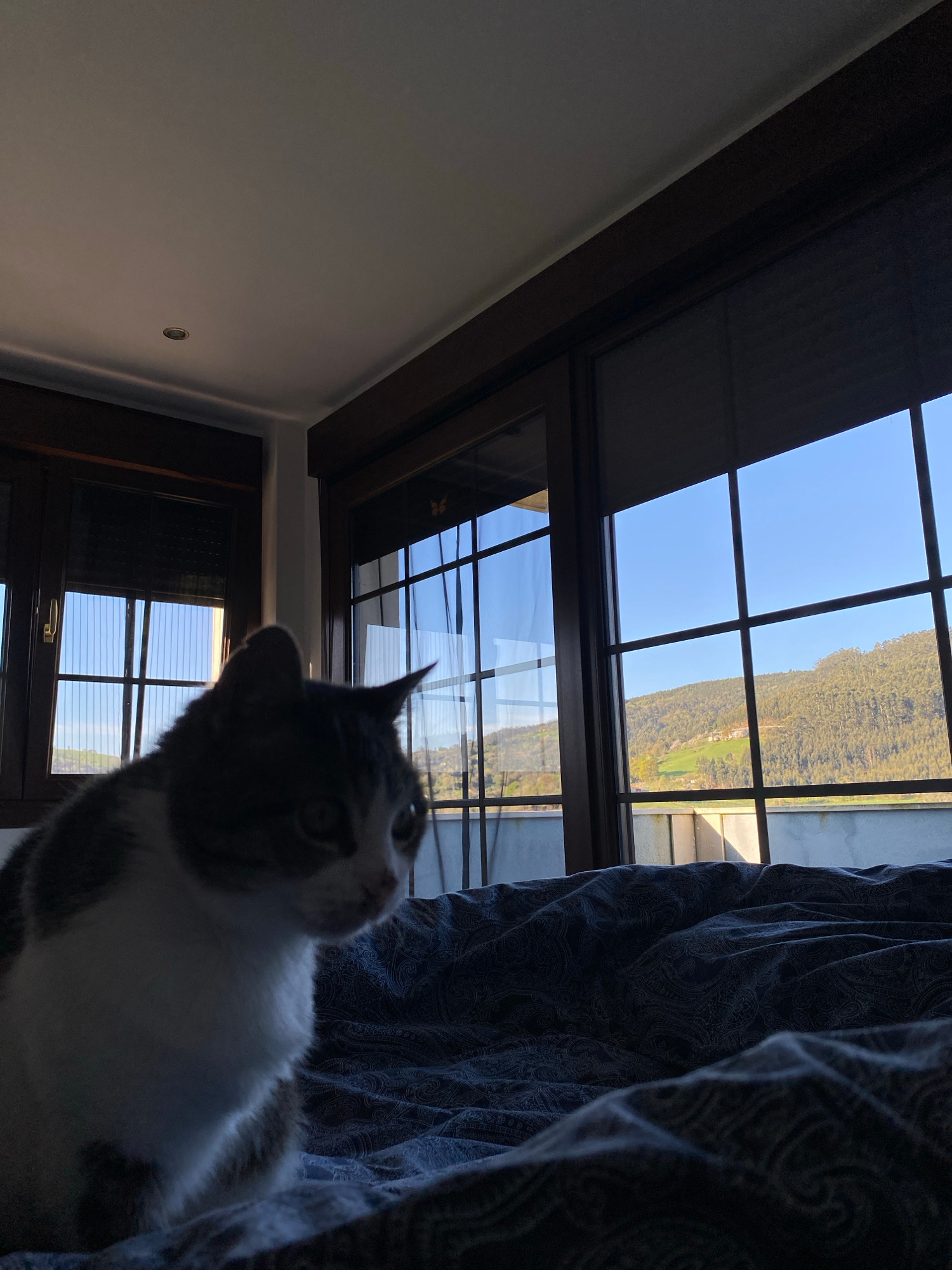 A medium shot, taken indoors, depicts a blurry grey and white cat in the foreground, with a backdrop of windows providing a view of Villaviciosa, Spain. The cat, positioned on a bed covered in patternβ¦read more