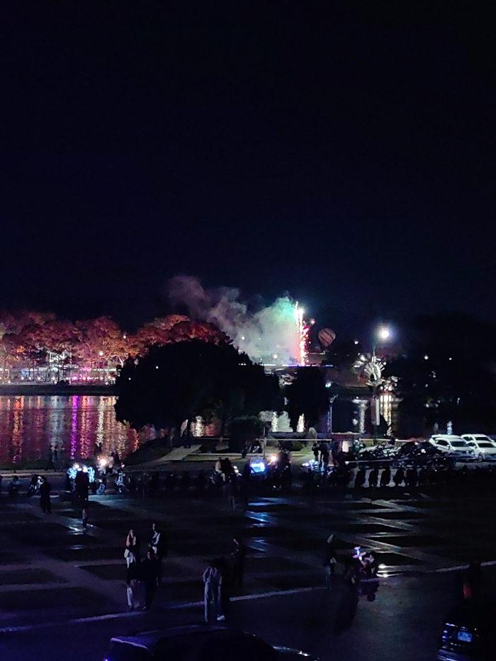 The image captures a nighttime scene during a fireworks display over Xuan Huong Lake in Da Lat, Vietnam. The dark sky is illuminated by colorful fireworks, showing vertical streaks of red, green, blue…read more
