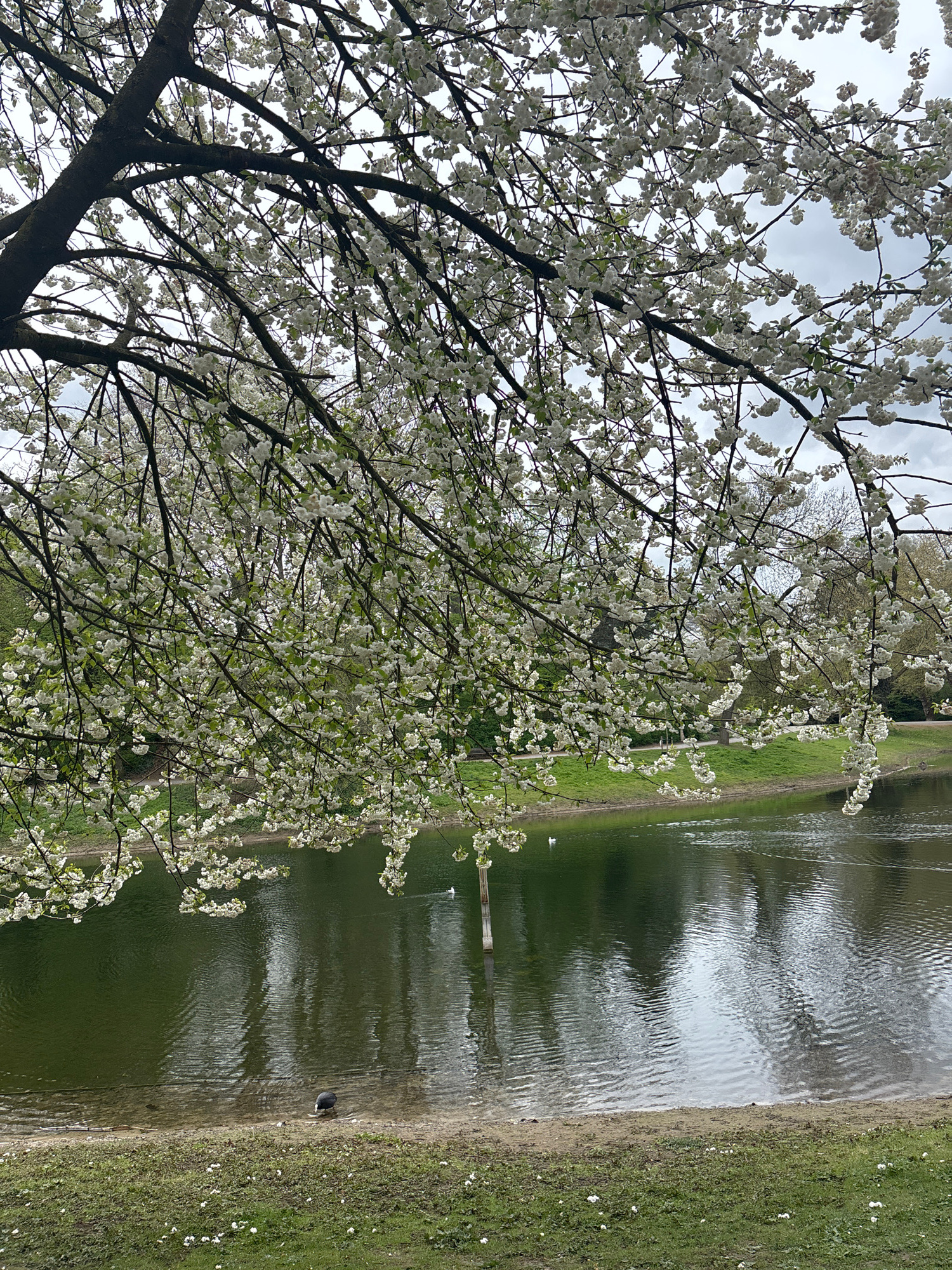 The image depicts a flowering tree along a waterway in Antwerp, Belgium. The tree, likely a cherry or other flowering fruit tree, is laden with white blossoms. The waterway has ripples on its surface,…read more