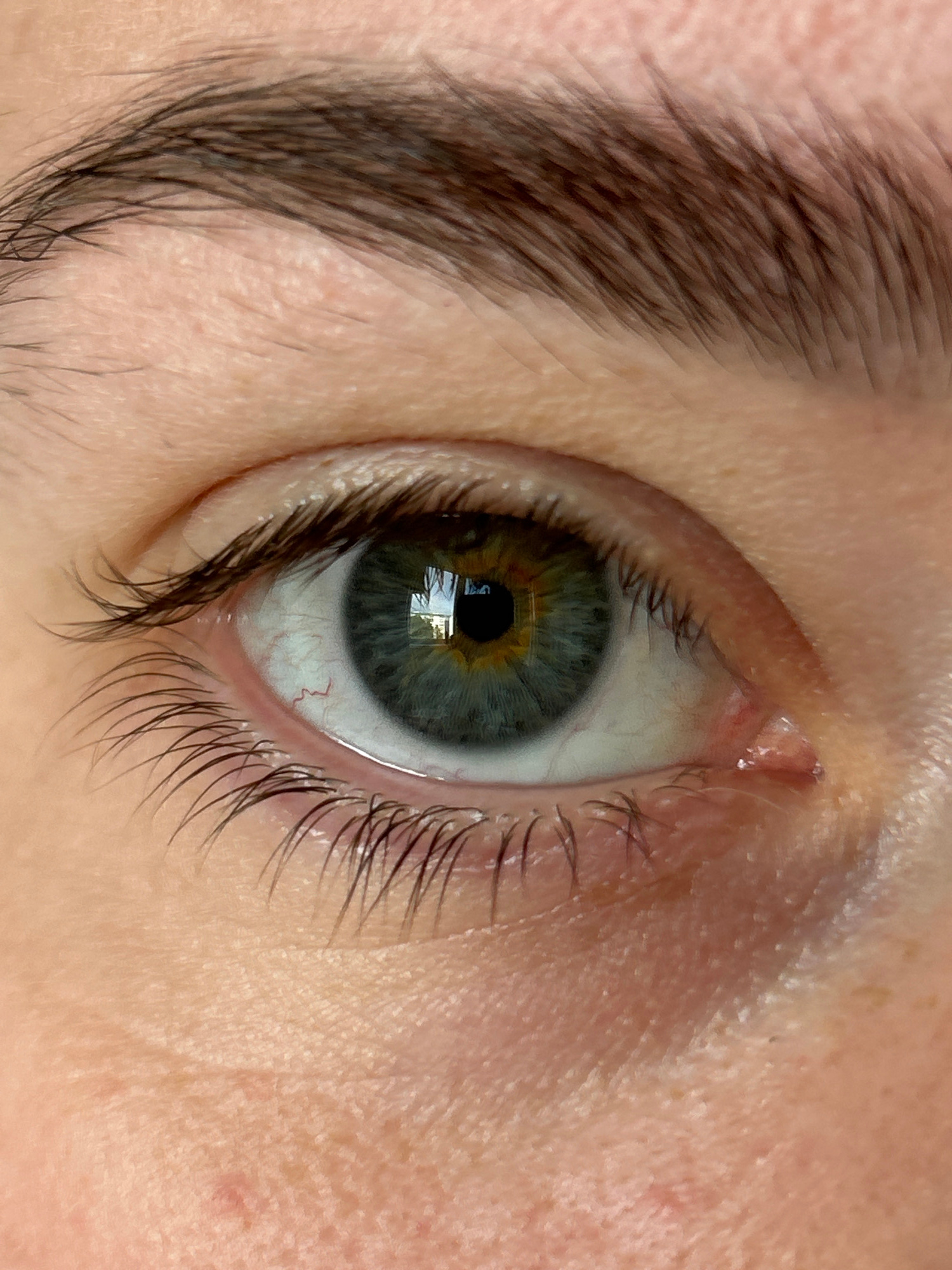 The image is a close-up of a human eye, likely from a female individual. The iris displays a heterogeneous coloration, with a prominent golden-brown ring surrounding the pupil, transitioning to a blui…read more