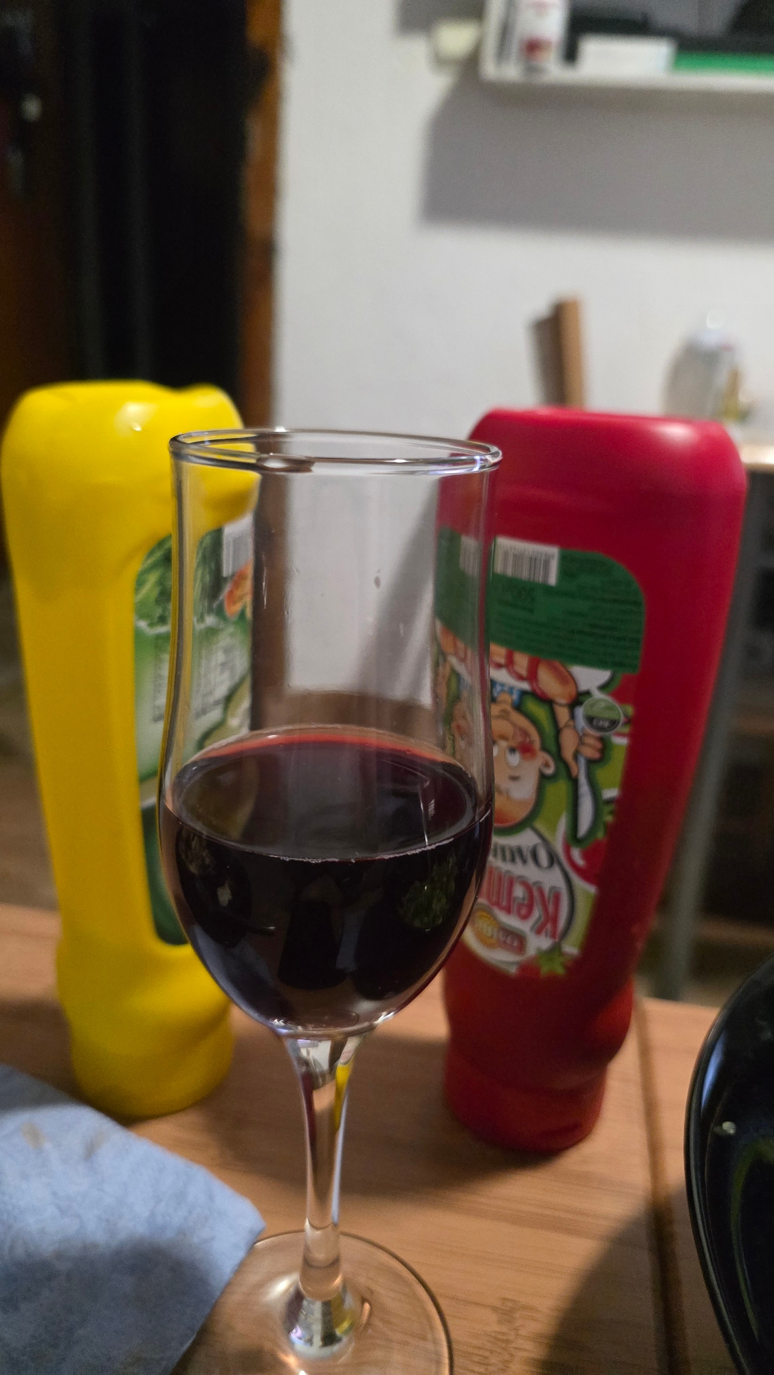 A wine glass filled with red wine is on a wooden surface next to bottles of ketchup and mustard. The label on the ketchup bottle is partially visible, showing a cartoon character and the word "Kem". T…read more