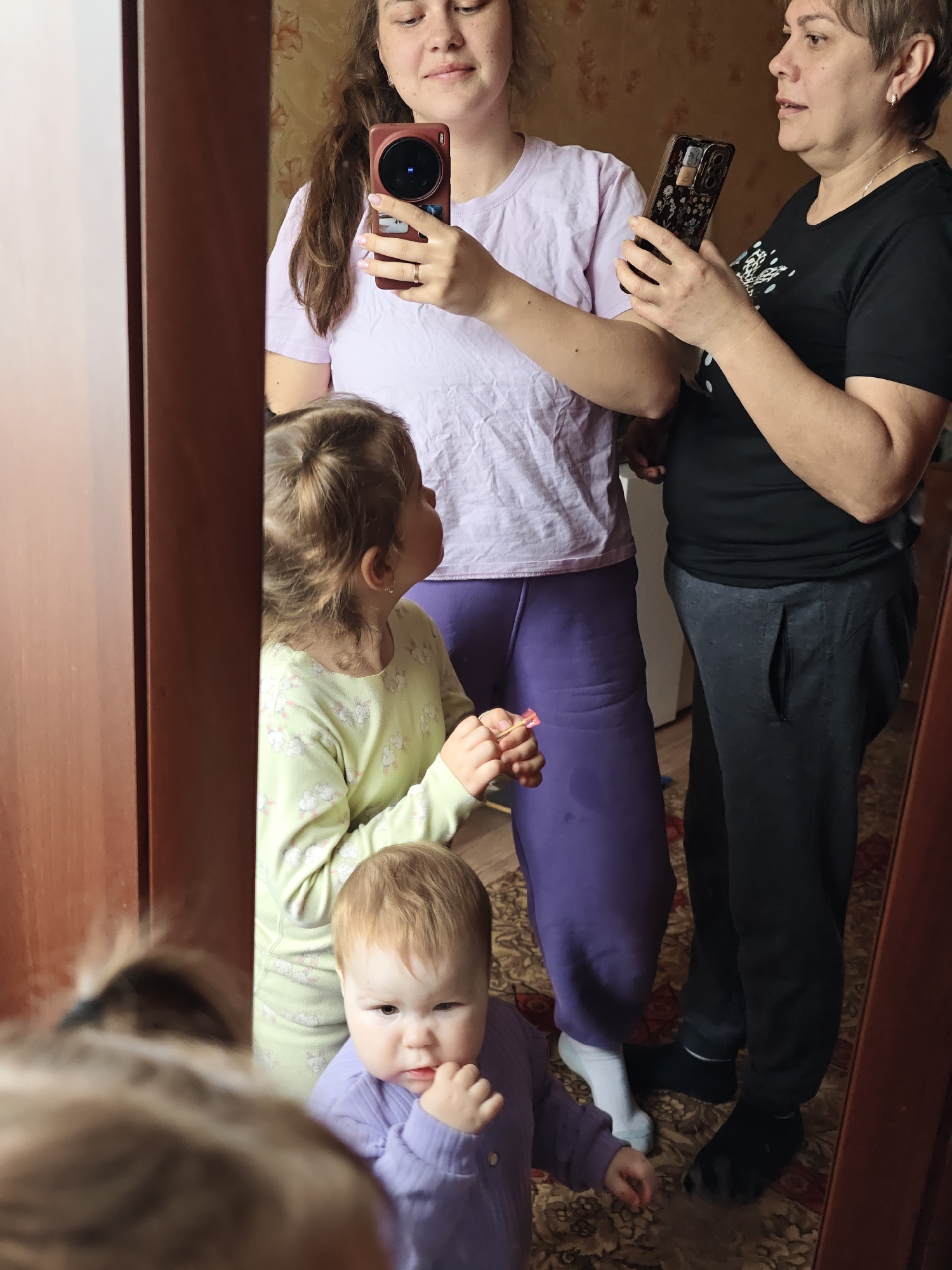 A mirror reflects two women holding phones, likely taking a picture or video of themselves and two young children. One woman wears a light purple t-shirt and dark purple sweatpants; the other wears a…read more