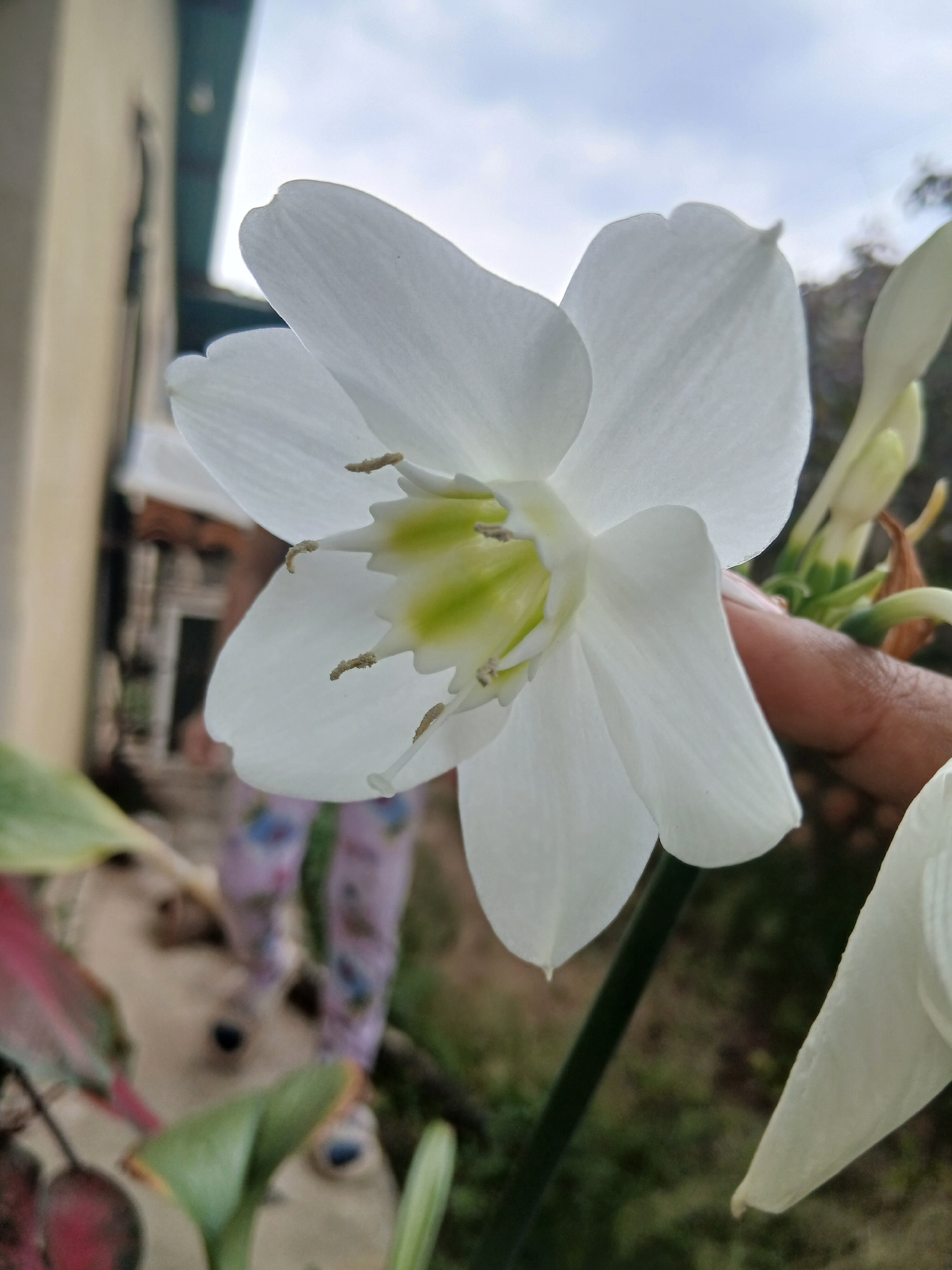 The image features a close-up view of a white flower with six petals and a greenish-yellow center. There is a human hand holding the flower. The background is blurred and includes foliage and what app…read more