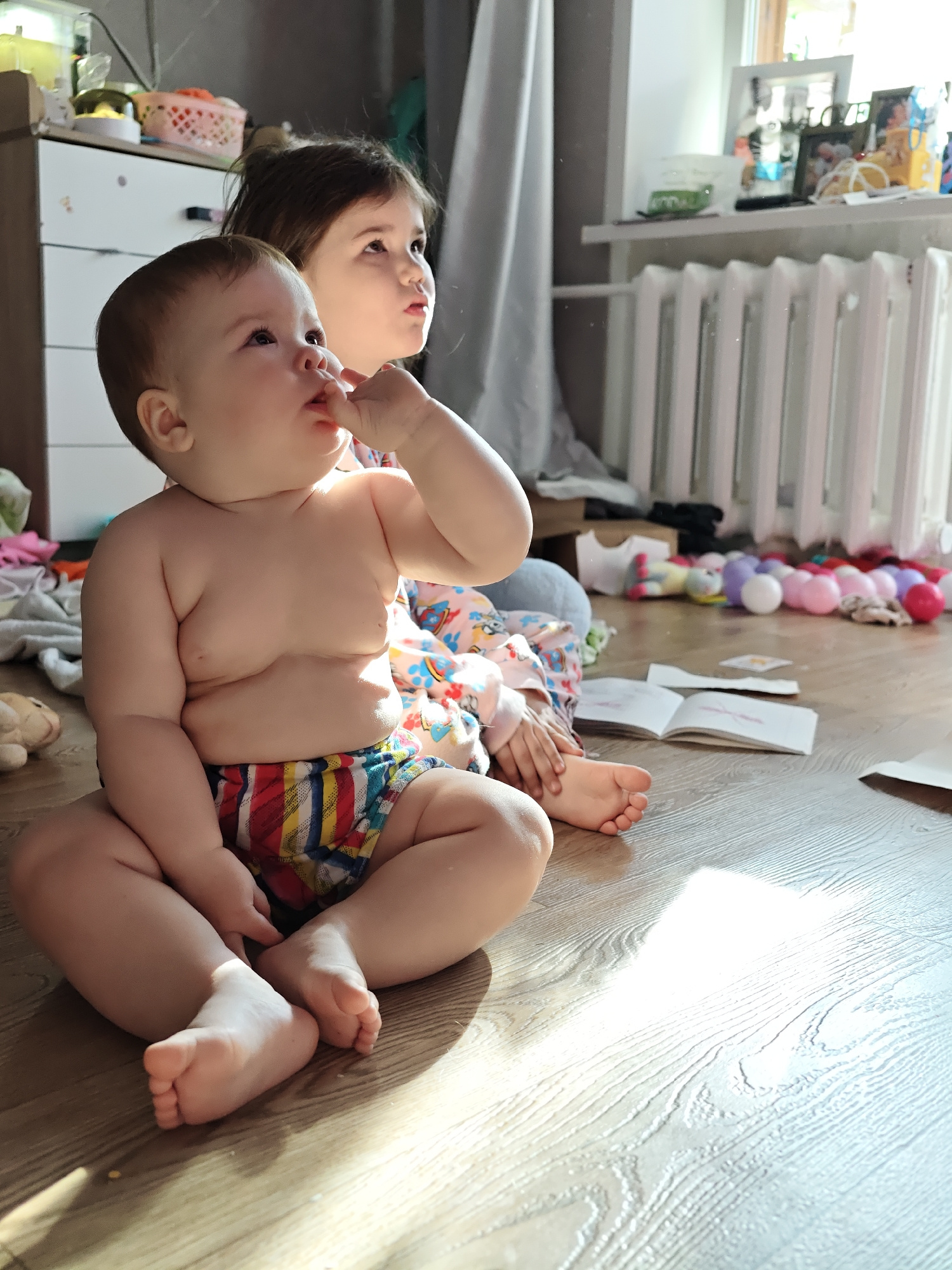 This image depicts two young children sitting on a wooden floor in a sunlit room, likely in Chaikovsky, Russia. In the foreground, a baby, possibly a toddler, sits with a chubby physique, wearing colo…read more