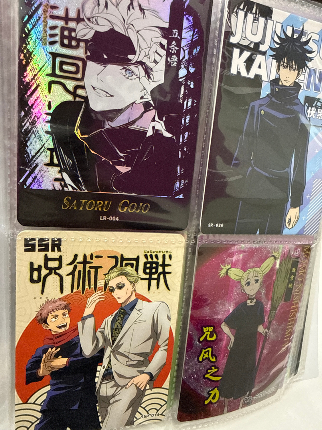 The image displays four collectible trading cards, likely from the "Jujutsu Kaisen" anime series, each housed in a clear plastic sleeve and arranged in a 2x2 grid. The cards are brightly colored and f…read more