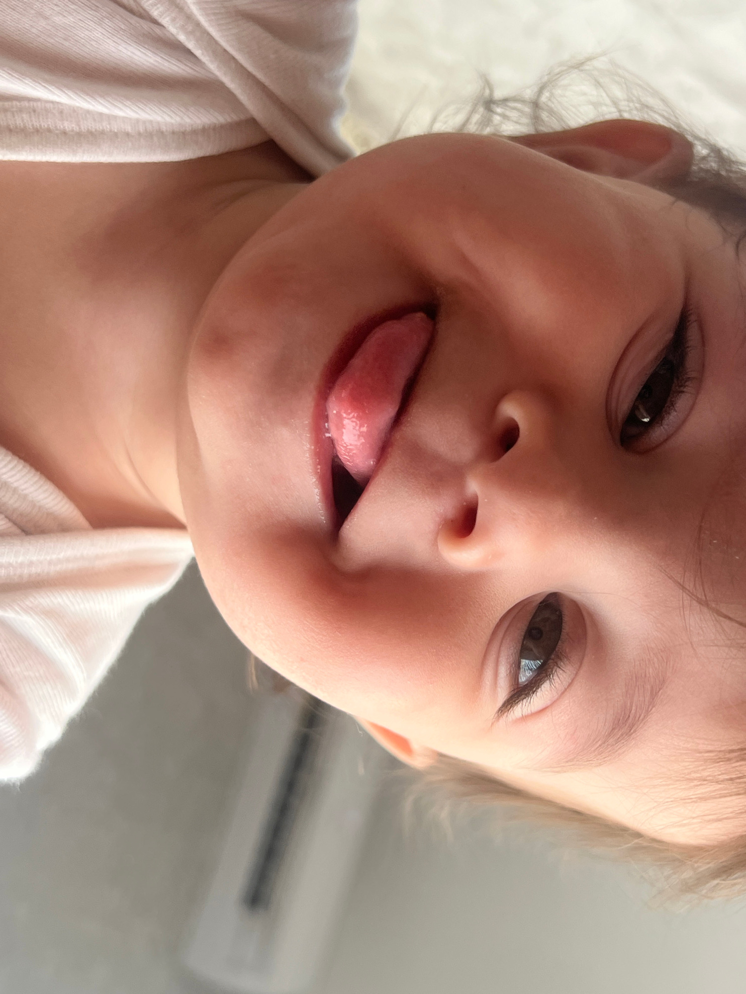 A close-up, low-angle photograph captures a joyful baby, likely a toddler, indoors in Elena, Bulgaria. The child's face dominates the frame, looking down towards the camera with a playful and happy ex…read more