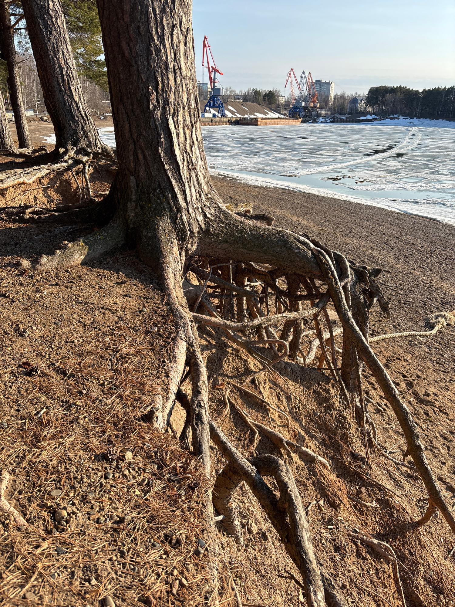 The image depicts a tree with exposed roots on a dirt slope. In the background, there's a frozen body of water and a cityscape. Red and blue cranes are visible along the shoreline. The image is horizo…read more