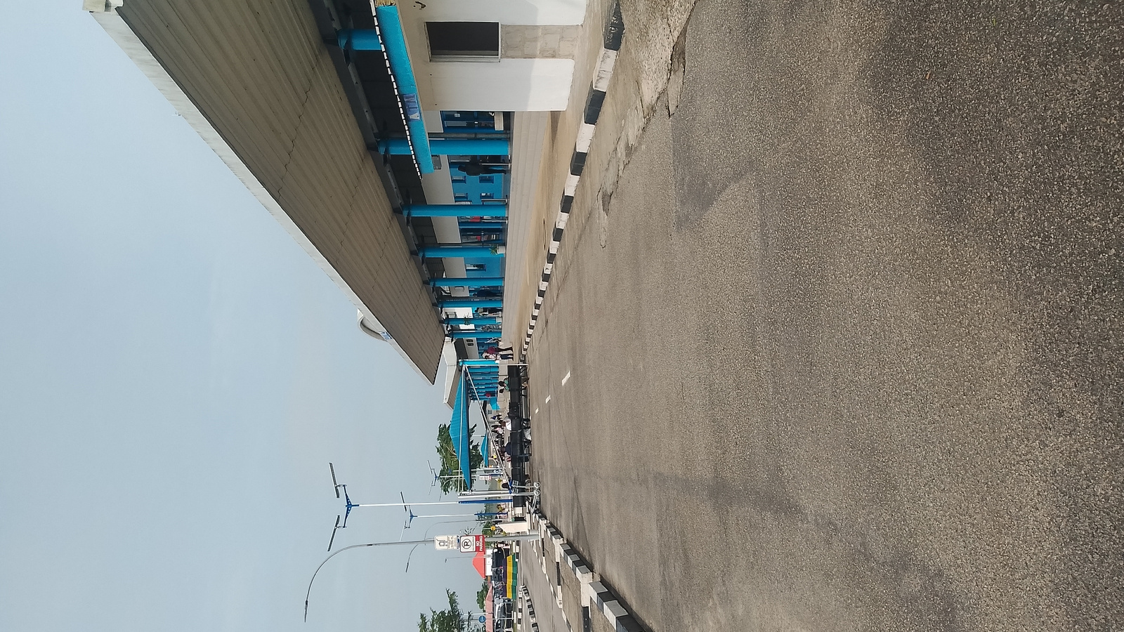 The image captures an outdoor scene in Orerokpe, Nigeria, featuring a long building alongside an asphalt road. The building has a distinct design with white walls, prominent blue support pillars, and…read more