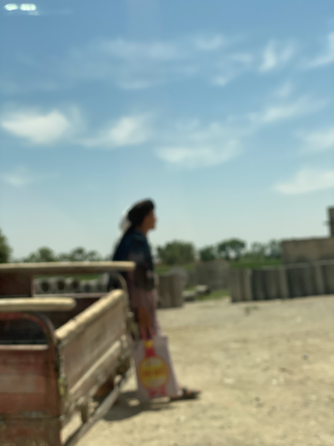 The image depicts a woman standing outdoors next to a rusted metal cart or small trailer. She appears to be carrying a shopping bag. The background includes what looks like stacked concrete blocks orβ¦read more