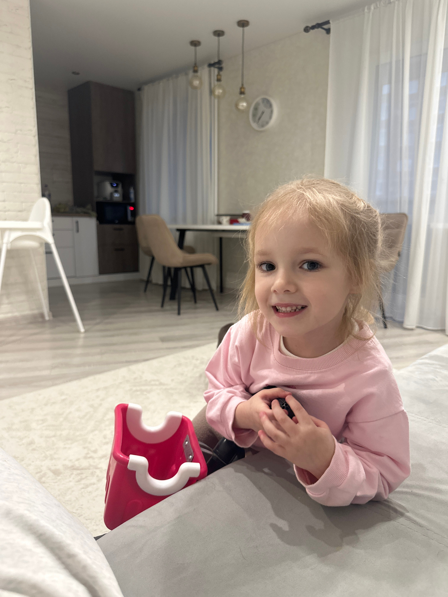 A child, approximately 3-4 years old with blonde hair and blue eyes, is seated on a gray sofa. She is wearing a light pink sweatshirt. She is holding a dark object in her hands. A pink and white child…read more