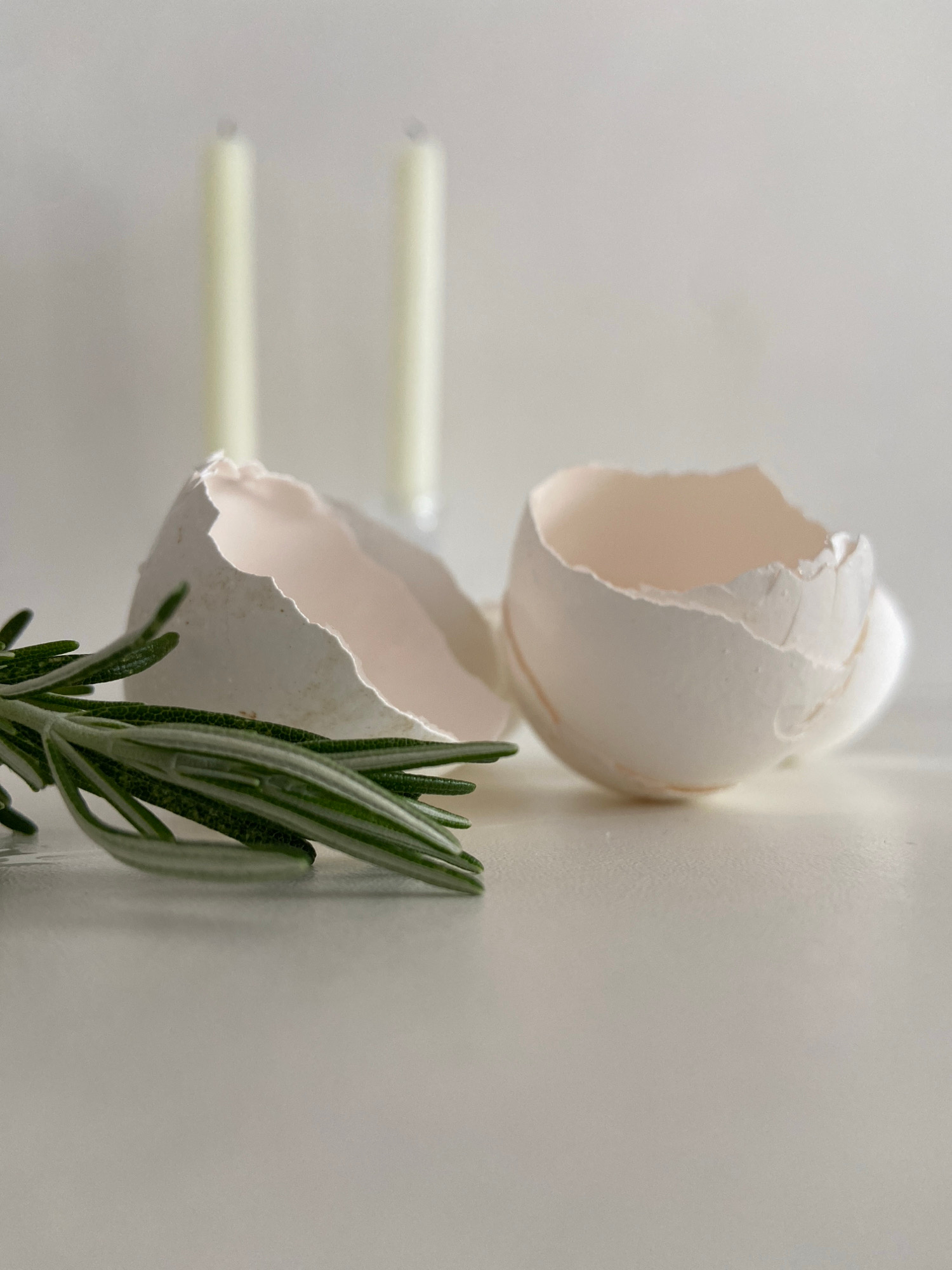 Two halves of a white eggshell, one stacked atop the other, lean against a white wall. A sprig of rosemary is nestled near the top eggshell, positioned alongside the wall. Two faint, horizontal lines…read more