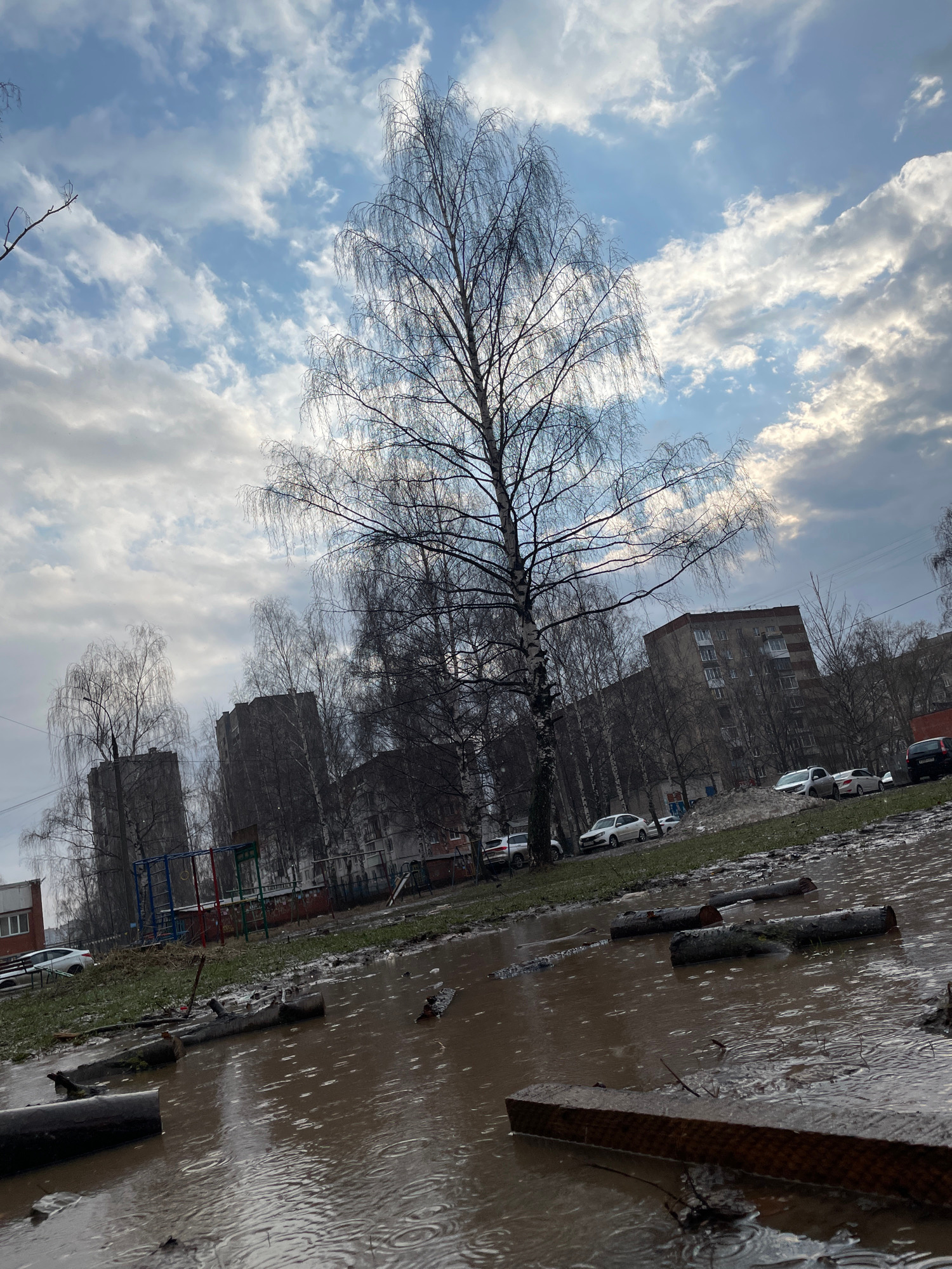 The image depicts a waterlogged area in what appears to be a courtyard or open space within an urban setting, likely in Izhevsk, Russia, given the presence of typical Soviet-era apartment buildings inβ¦read more
