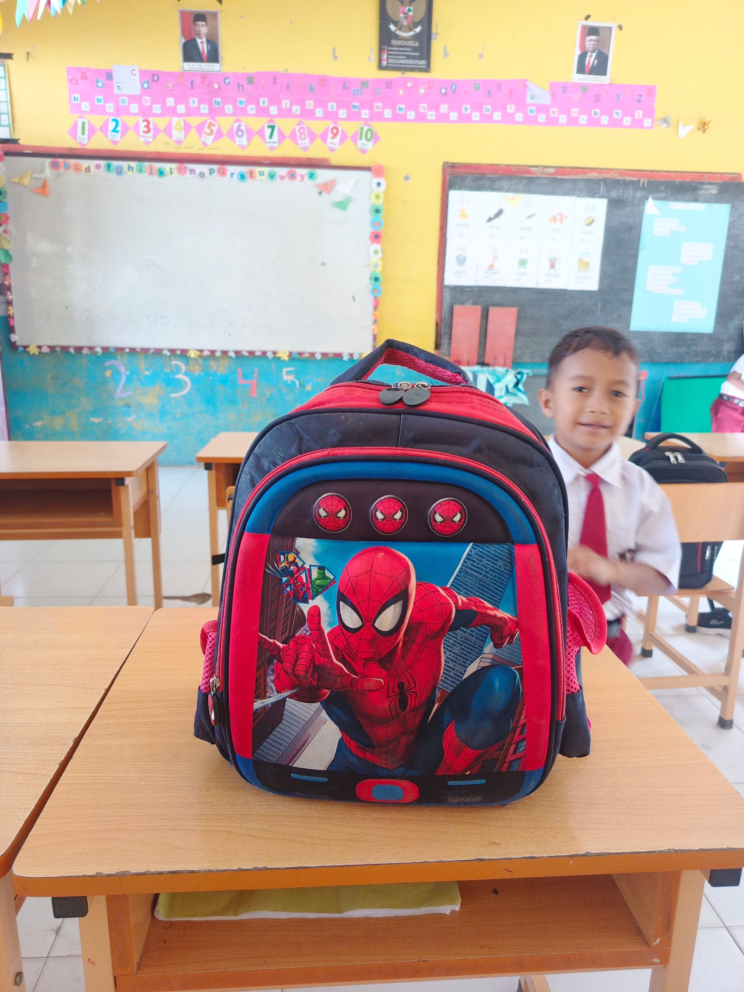 Here's a description of the image: The photo is taken inside a classroom in Simpangjaya, Indonesia. A backpack with a Spiderman design is prominently placed on a wooden desk in the foreground. The ba…read more