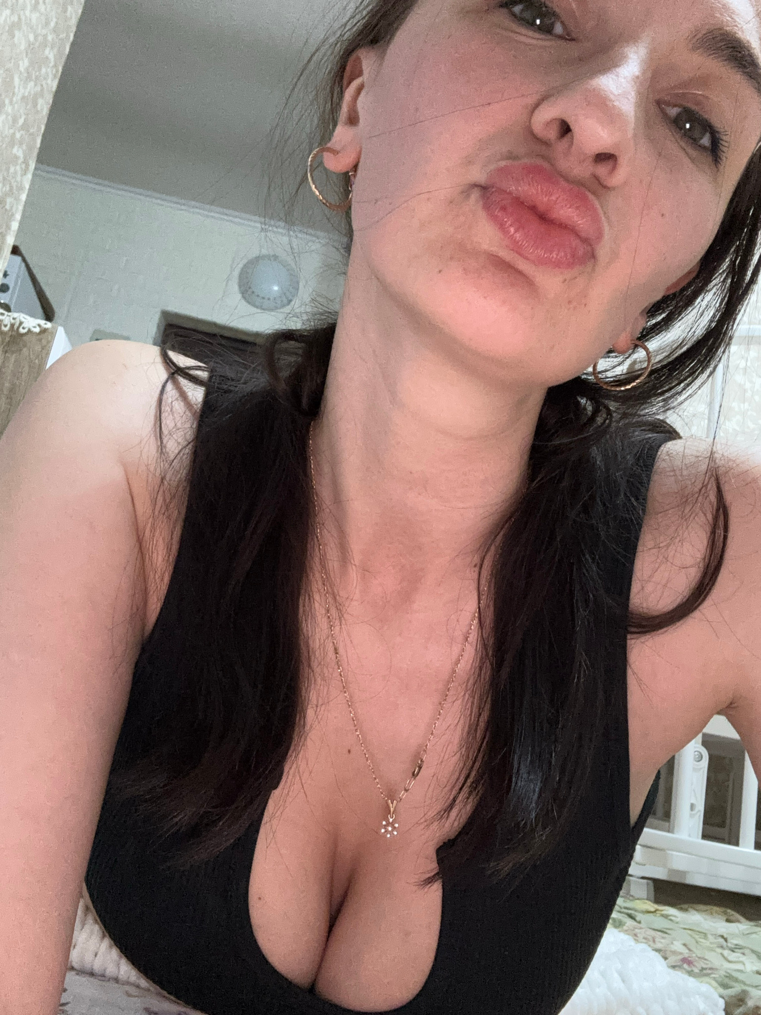 A close-up, selfie-style image of a woman with fair skin, dark hair, and light eyes is presented. She is wearing gold hoop earrings and a delicate gold necklace with a small flower-shaped pendant. The…read more