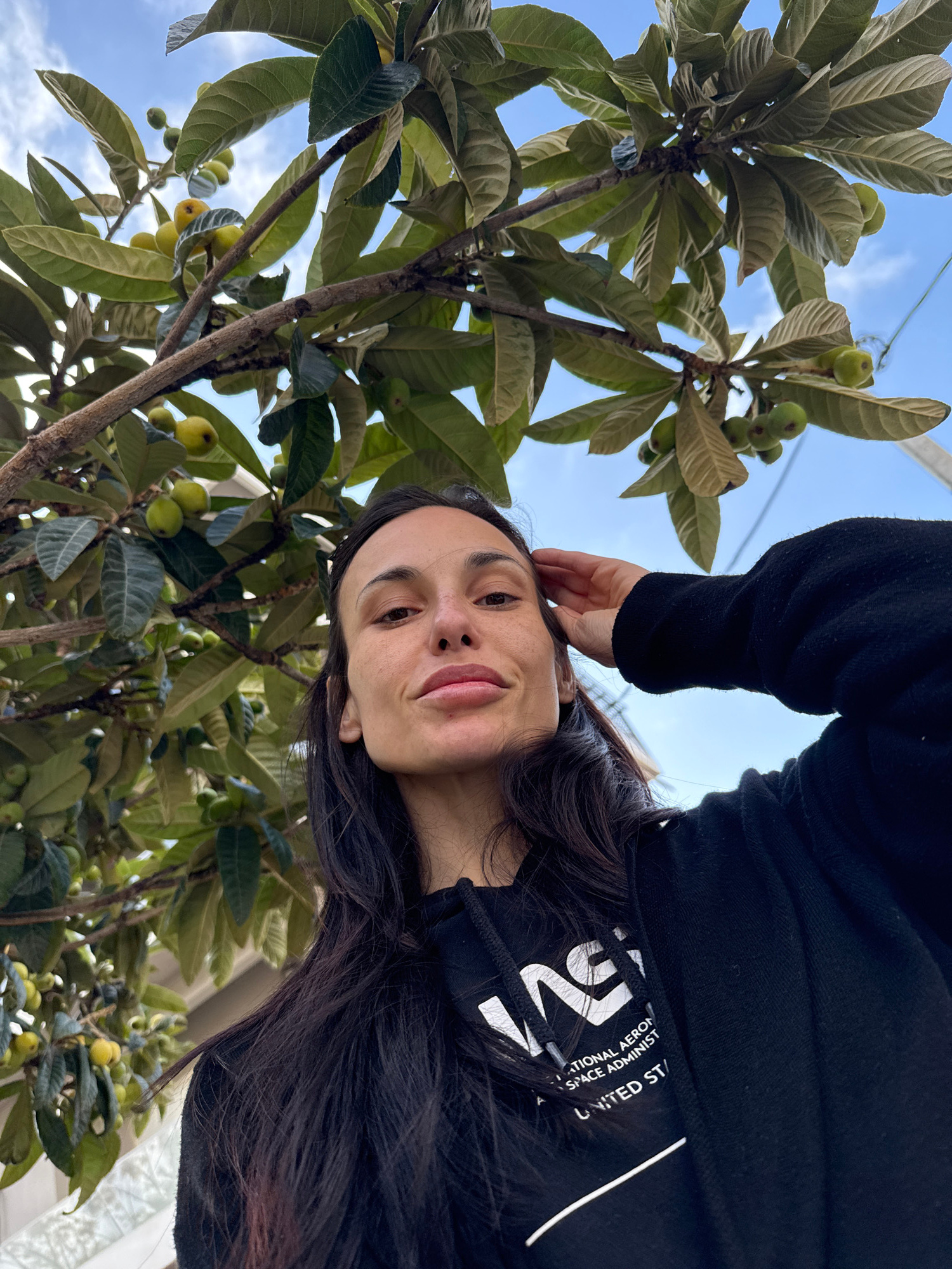 The image shows a woman standing under a loquat tree with green fruits. She is wearing a black hooded sweatshirt with white lettering that includes the words "NATIONAL AERONAUTICS SPACE ADMINISTRATION…read more
