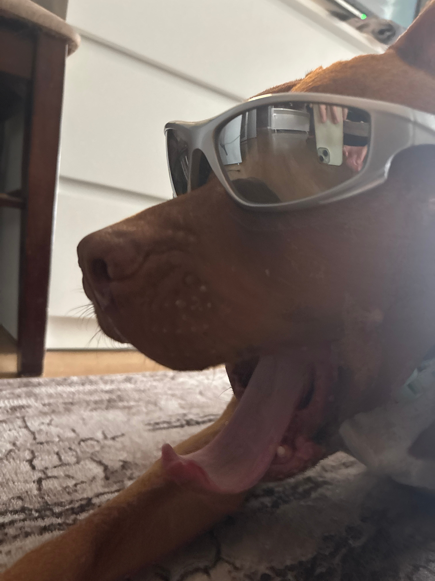A close-up, upward-angled shot shows a brown dog wearing silver-framed sunglasses, with its tongue hanging out. A person's hand holding a cell phone is reflected in the lens of the glasses. The dog is…read more