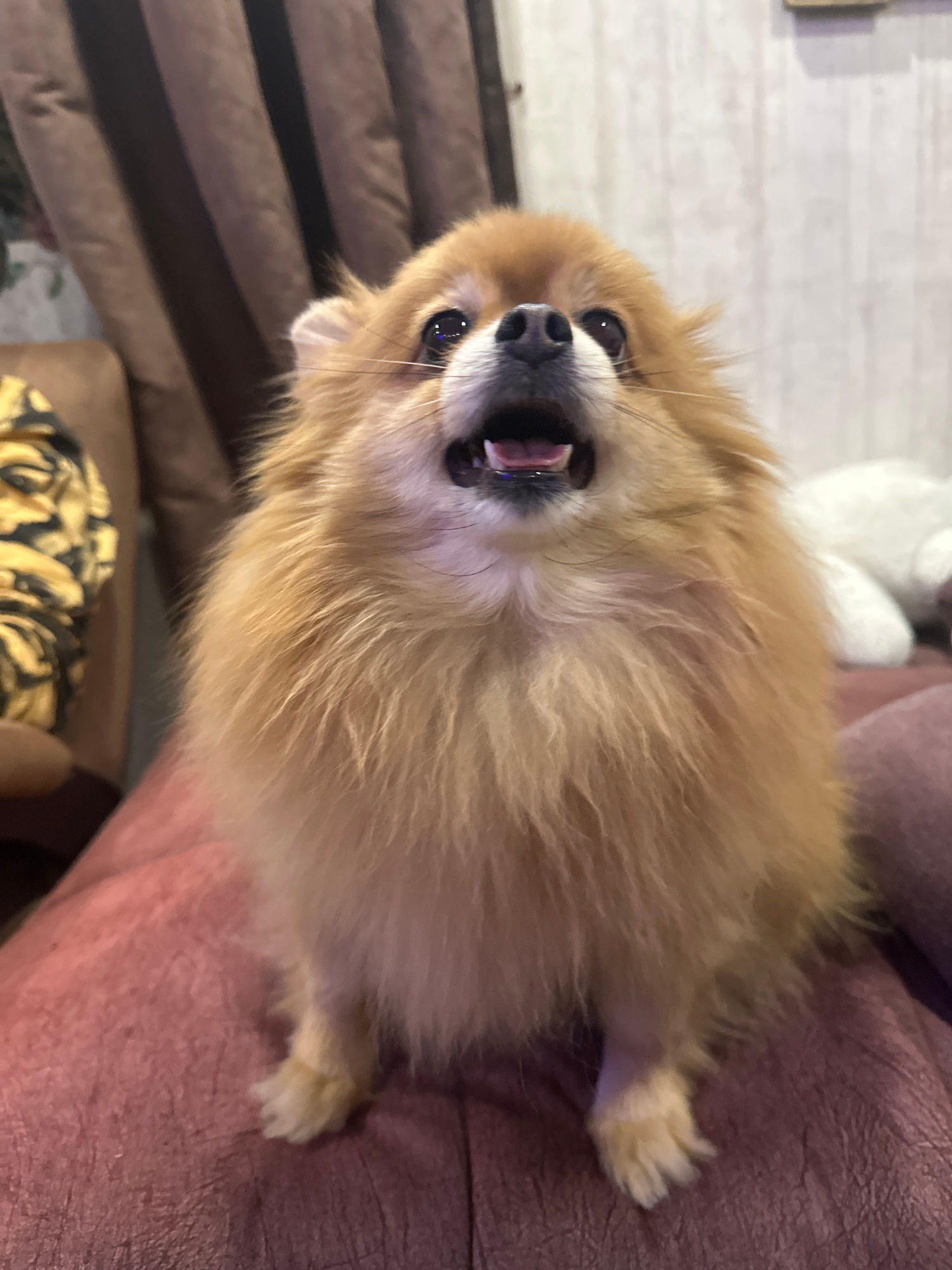 A small, fluffy dog, likely a Pomeranian, with light brown to tan fur, is the central subject of the image. The dog's head is positioned towards the left side of the frame, and it looks directly at th…read more