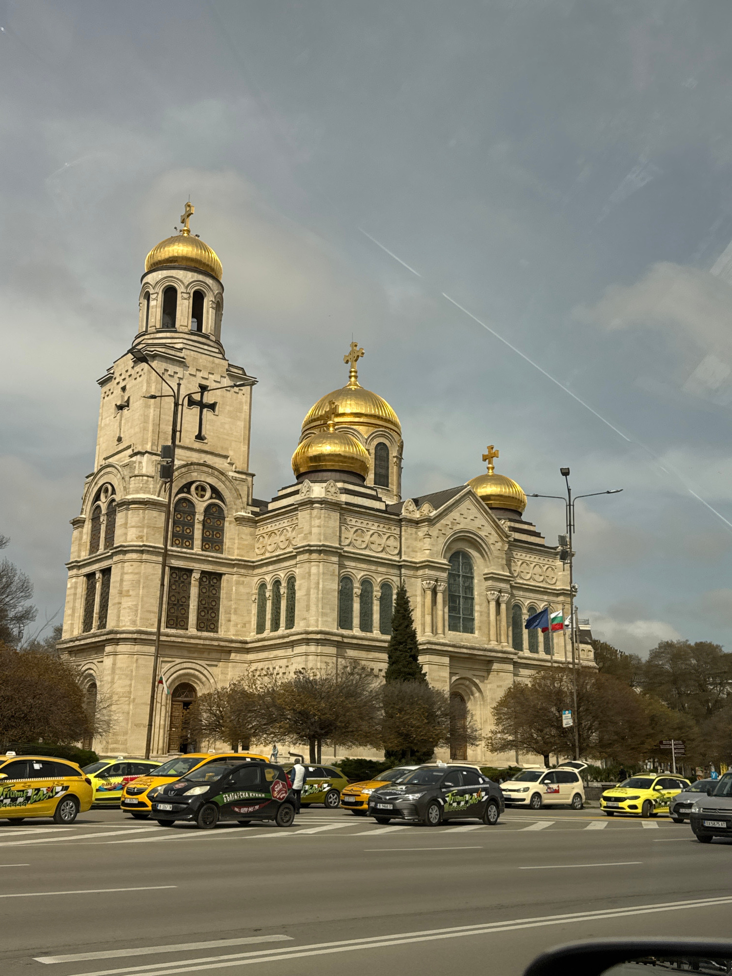The image depicts the Dormition of the Mother of God Cathedral in Varna, Bulgaria, viewed from a street-level perspective. The architectural style of the cathedral is prominent, showcasing its golden…read more