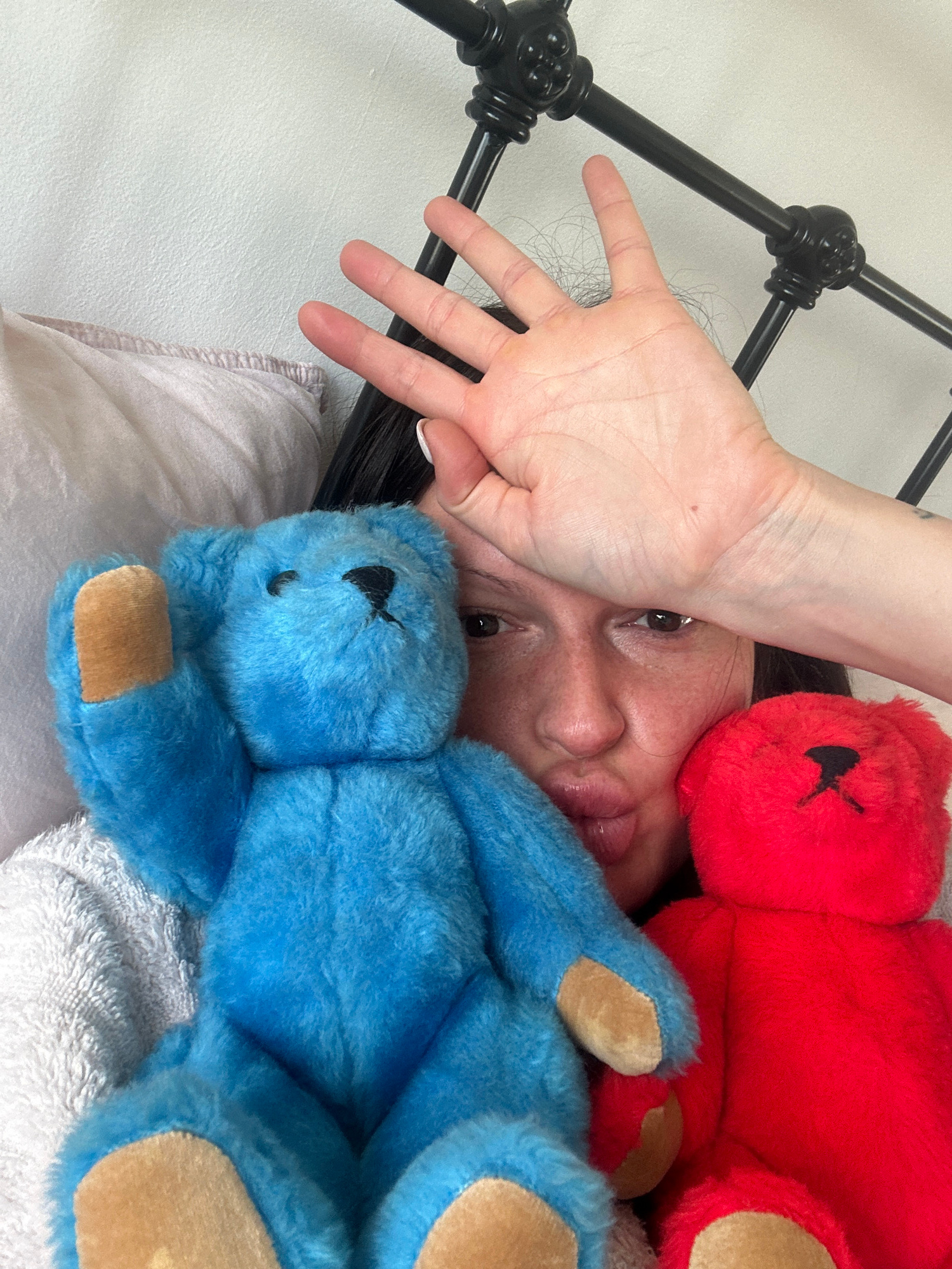A female individual is depicted in a close-up, selfie-style photograph taken indoors. She has dark hair, brown eyes, and fair skin with visible pores and freckles. Her lips are pursed in a "duck face"…read more