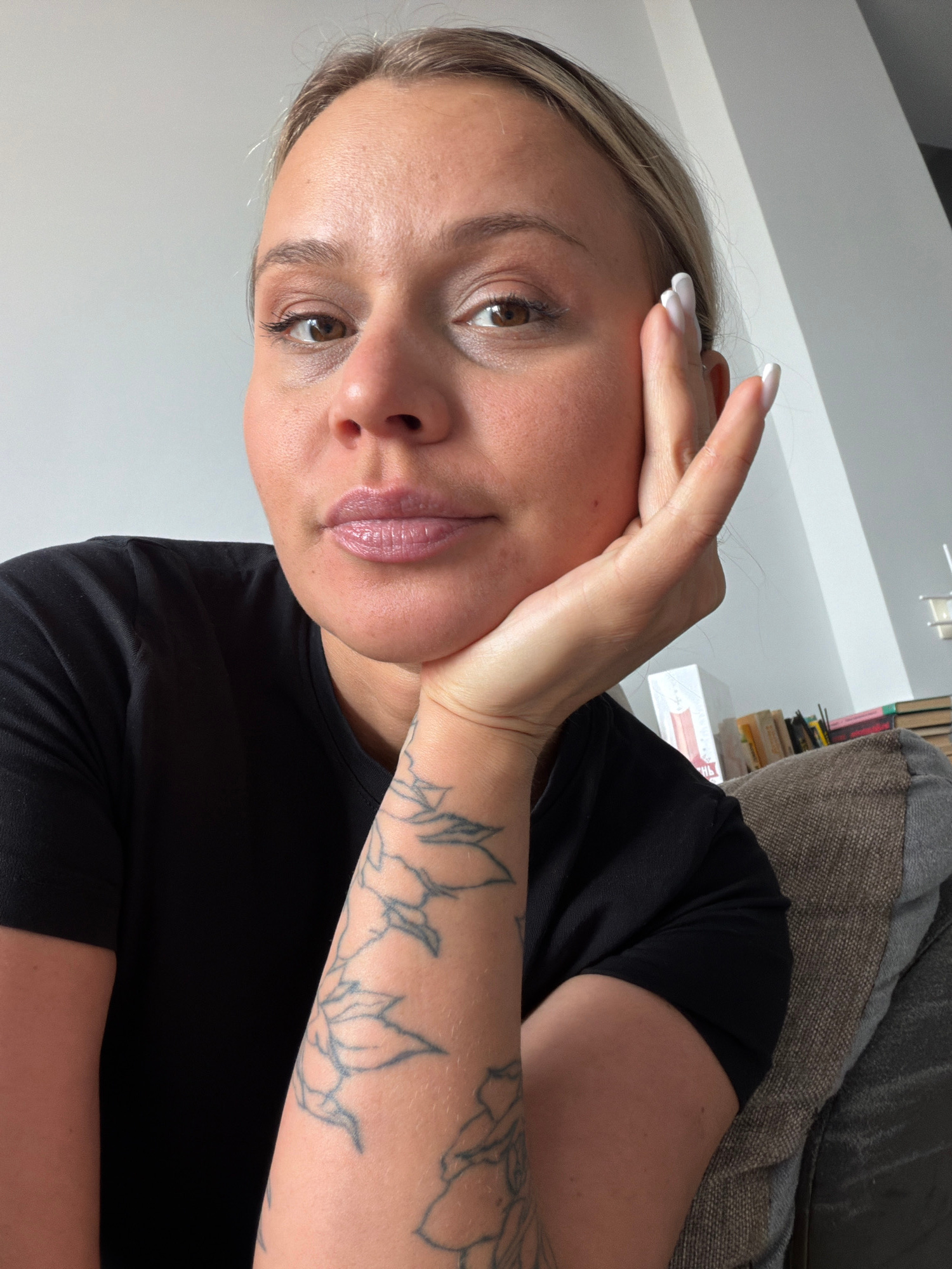 A woman with light brown eyes and fair skin is looking at the camera with a slight smile. She is wearing a black shirt. Her left hand is supporting her face. She has a tattoo of flowers on her left fo…read more