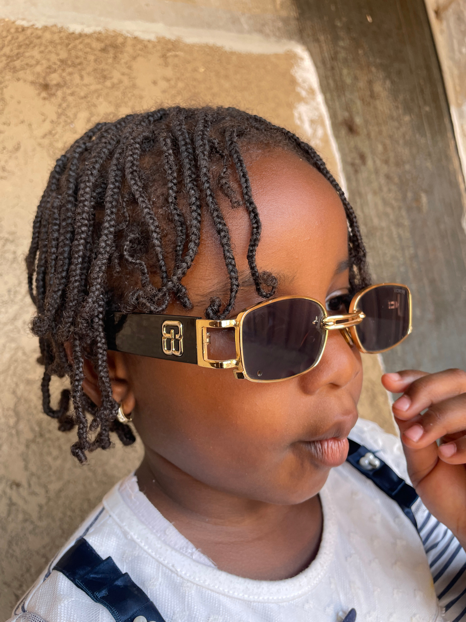 A close-up, high-angle photograph shows a child with dark skin, presumably in Jos, Nigeria, wearing sunglasses perched on their head. The child has braided hair. They are wearing a white shirt with a…read more