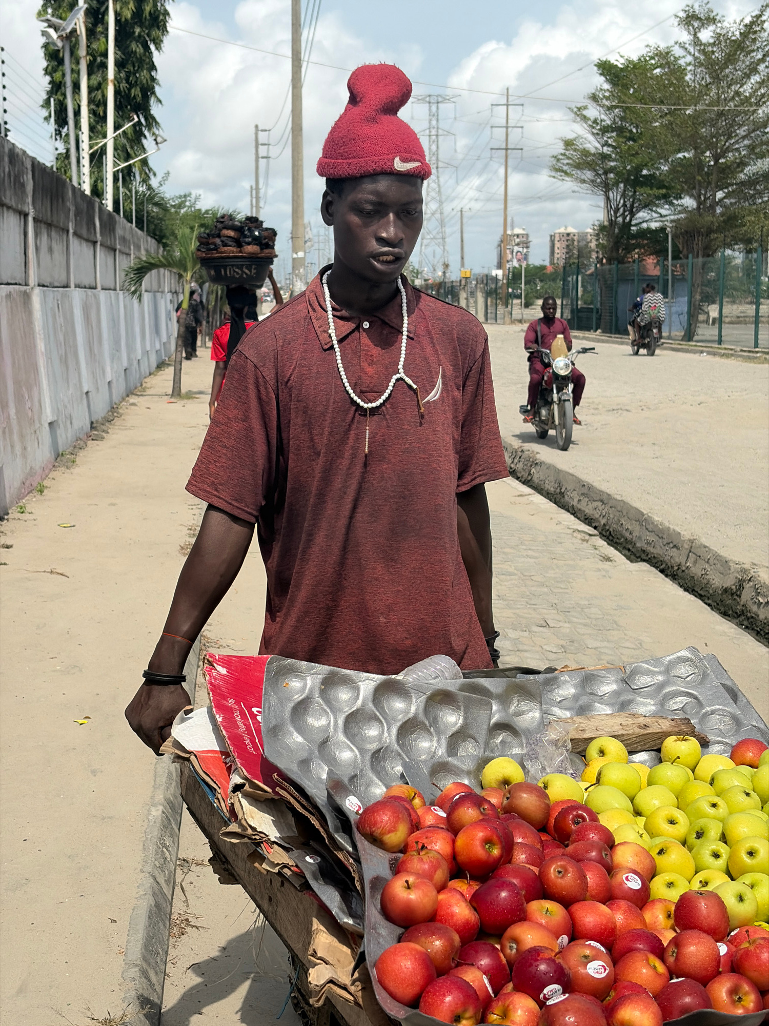 The image shows a man in Igboefon, Nigeria, standing next to a display of apples for sale. He is wearing a red hat, a maroon shirt, and a white beaded necklace. The apples are arranged in a tray, with…read more