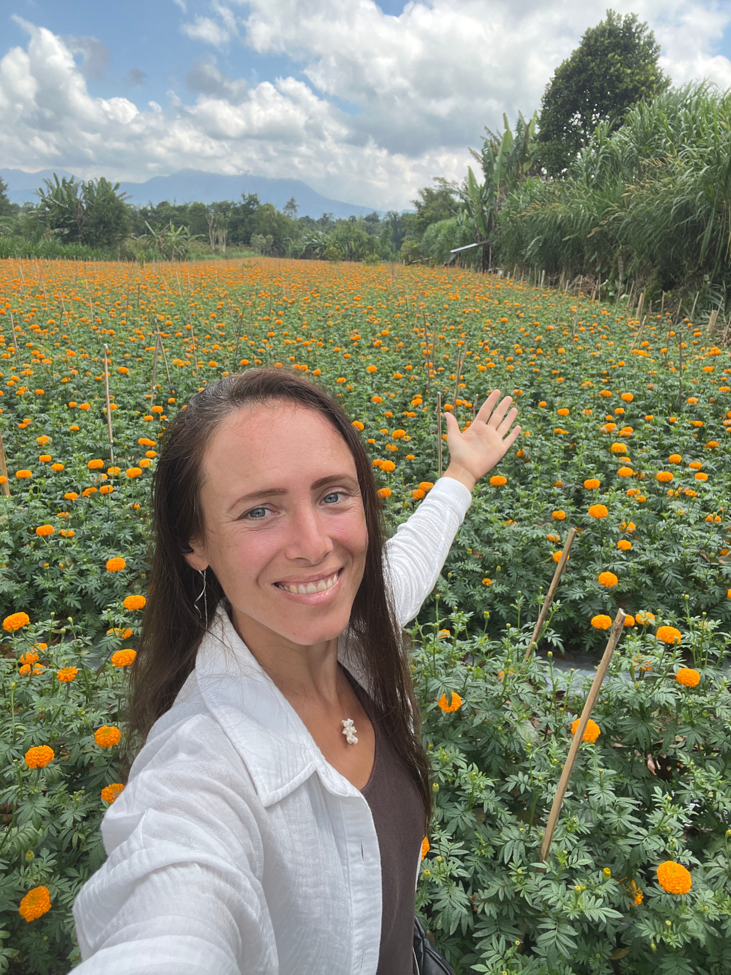 The image shows a woman standing in a field of orange flowers, potentially marigolds, in Kintamani, Indonesia. The landscape is a field full of the orange flowers with rows of bamboo sticks. The woman…read more