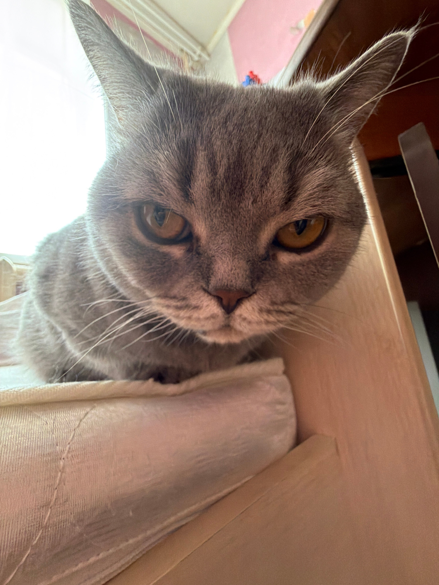 An indoor, low-angle photograph taken in Perm, Russia, captures a grey domestic cat, likely a British Shorthair, peering out from a partially enclosed space. The cat's head is tilted, and its large, r…read more