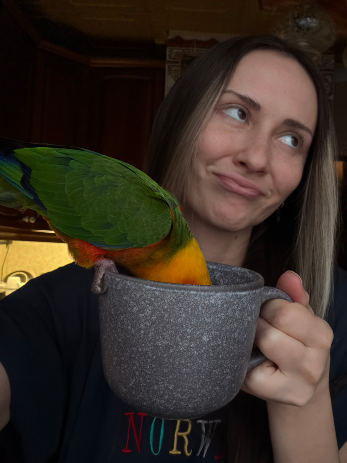 The scene captures an indoor setting in Khimki, Russia, featuring a woman and a parrot. The woman, with long brown hair featuring lighter highlights, is wearing a dark blue t-shirt embroidered with th…read more