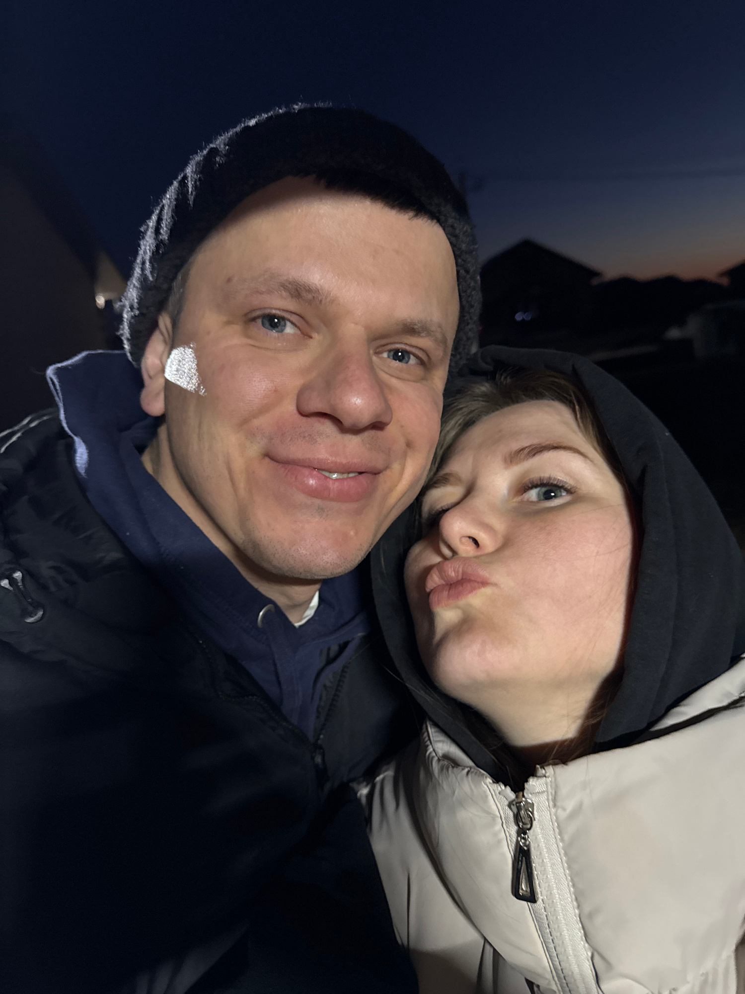 The image shows a selfie of two people. A man with short hair and a black beanie is on the left, smiling at the camera. He has a shiny, heart-shaped object stuck to his cheek. Next to him, a woman wit…read more