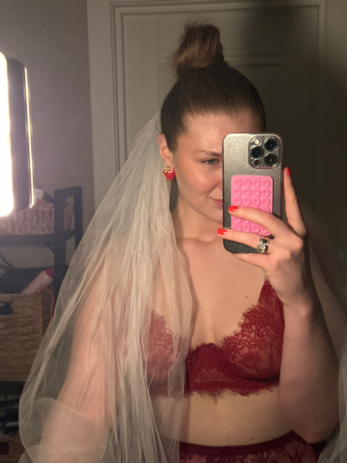 The image displays a female individual taking a mirror selfie indoors, in what appears to be a private residence in Kazan, Russia. The woman, shown from approximately the chest up, has her brown hair…read more