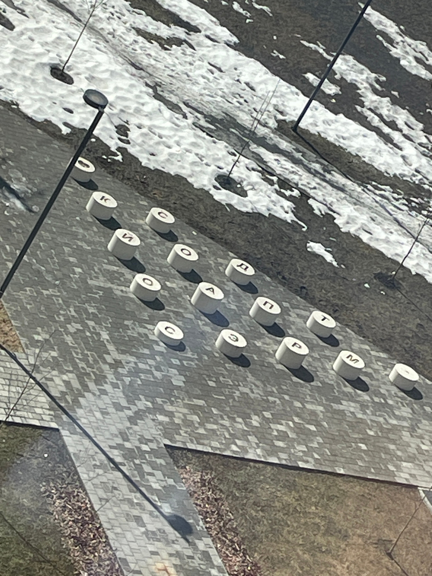 The image depicts a section of paved walkway in Izhevsk, Russia, adjacent to a snow-covered area. The walkway is lined with cylindrical concrete blocks, each displaying a different Cyrillic letter. Th…read more