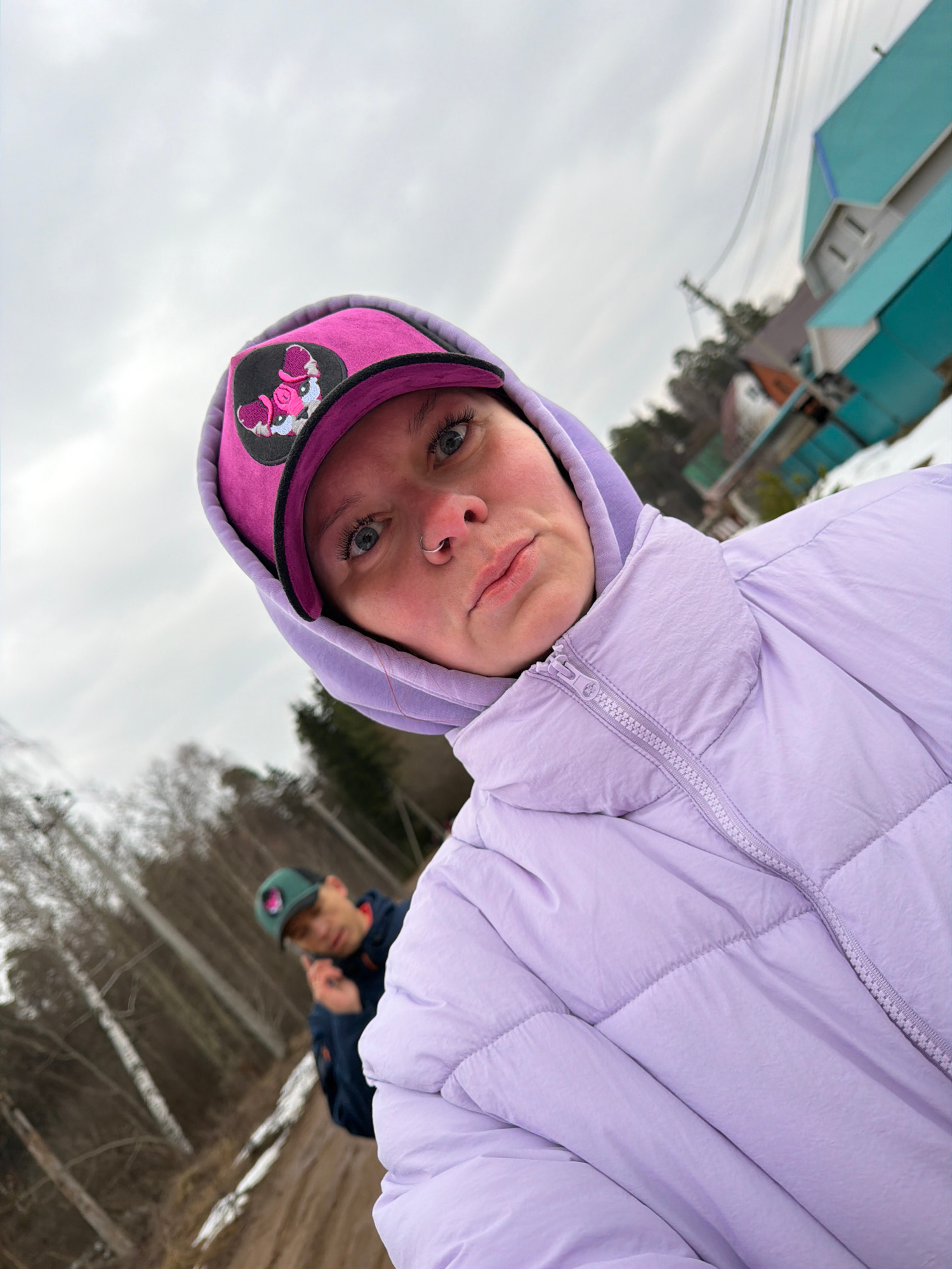 A young person wearing a lilac puffer jacket and a pink baseball cap is pictured. The image appears to be a selfie taken outdoors on a cloudy day. In the background, another person wearing a navy jack…read more