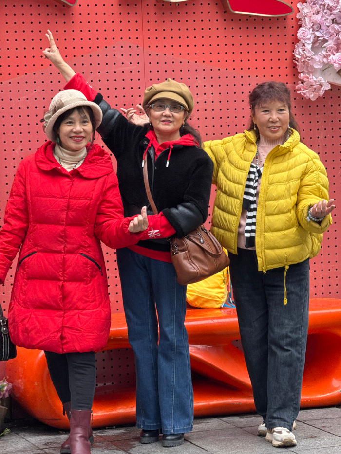 Three East Asian adult females are depicted standing and posing for a photograph outdoors in Liangjiang, China. They are positioned in front of a vibrant red wall featuring a uniform pattern of blackβ¦read more