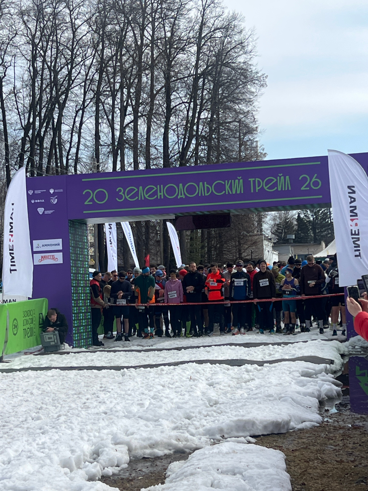 The image shows the starting line of the "20 Zelenodol'skiy Trail 26" race in Zelenodol'sk, Russia. Runners are assembled at the starting line beneath an arch displaying the race name in Russian and t…read more