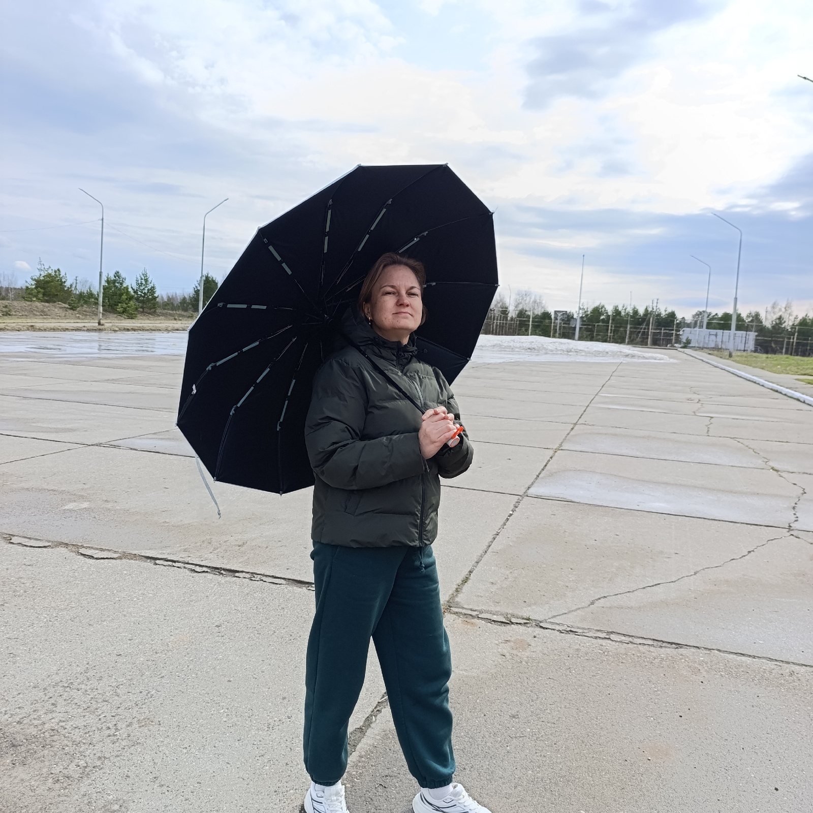 A woman stands on a cracked concrete surface holding a black umbrella, likely in Markovskii, Russia. She is wearing a dark green puffer jacket, dark green sweatpants, and white sneakers. Behind her isβ¦read more