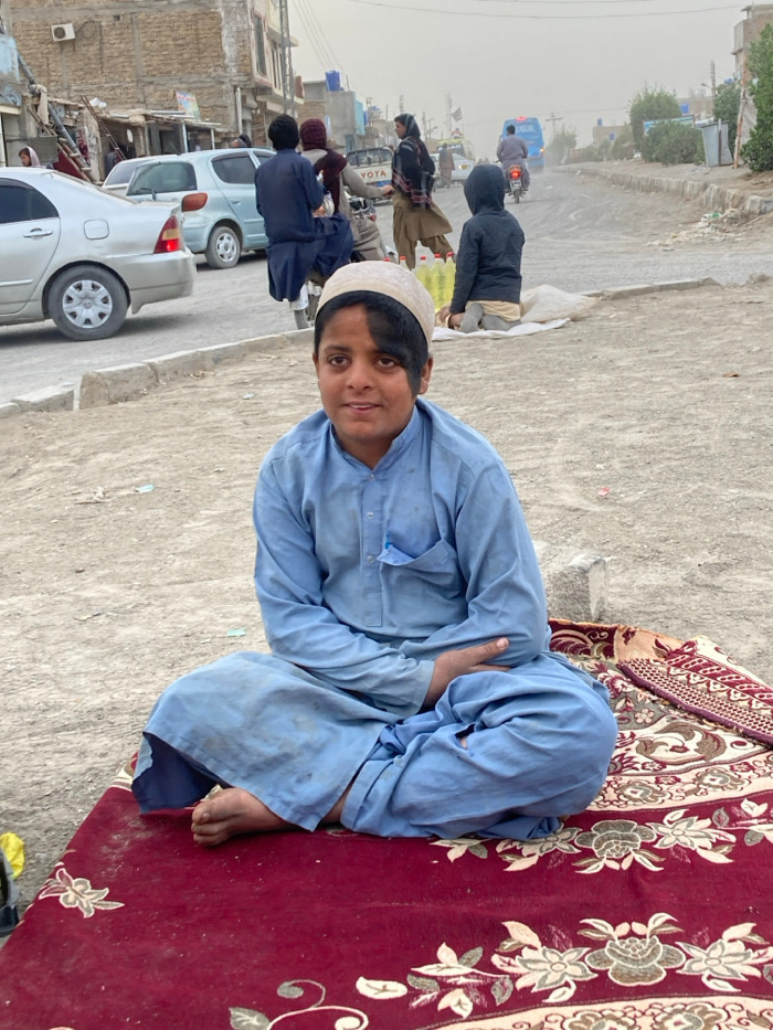 An outdoor scene in Taftan, Pakistan, depicts a dusty urban street with a young boy seated in the foreground. The boy, dressed in a light blue shalwar kameez and a light beige skullcap, faces the came…read more