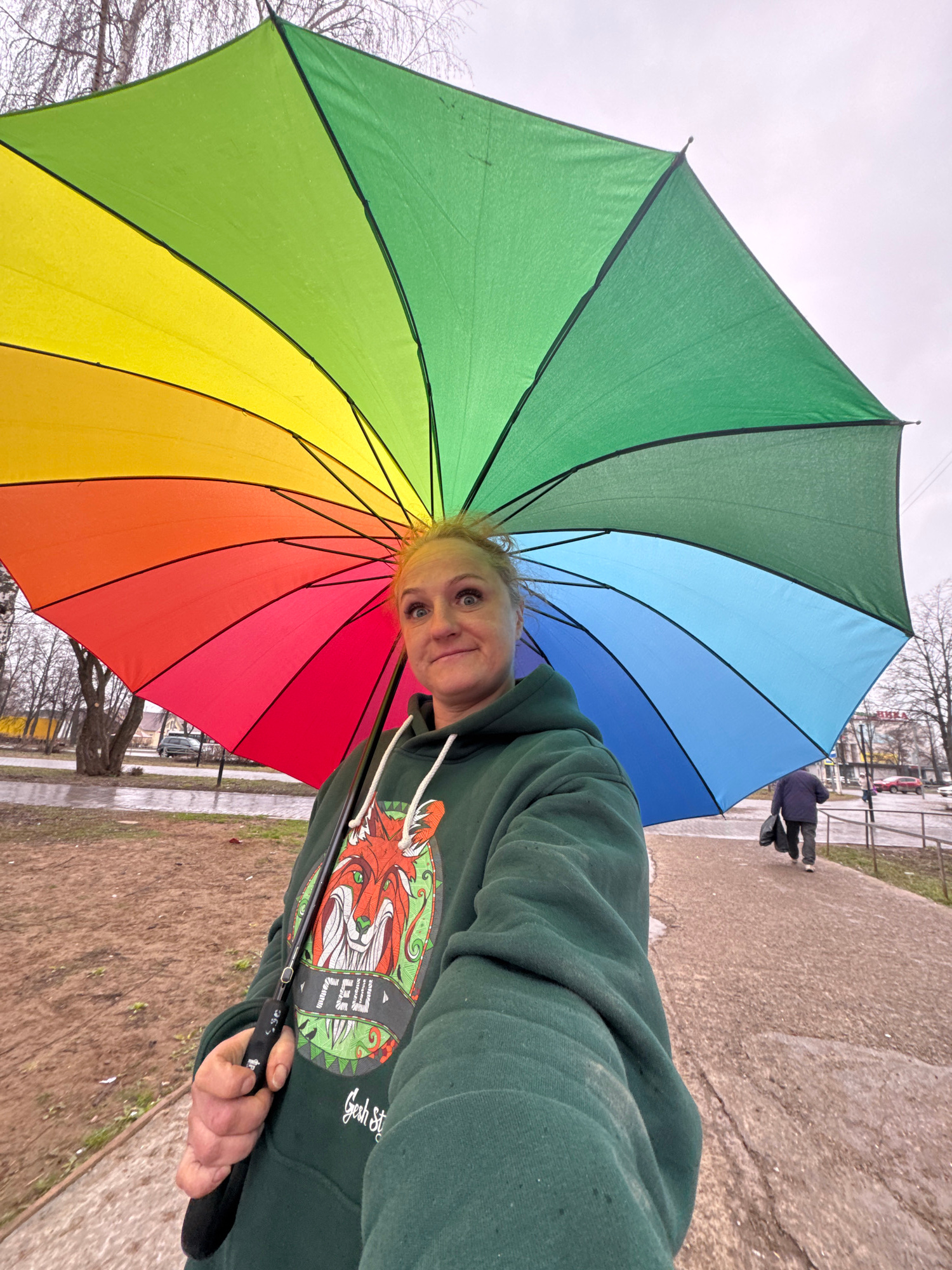 A woman is holding a rainbow umbrella while taking a selfie outdoors. She is wearing a green hooded sweatshirt with a graphic design. In the background, there is a sidewalk, street, and buildings. Bar…read more