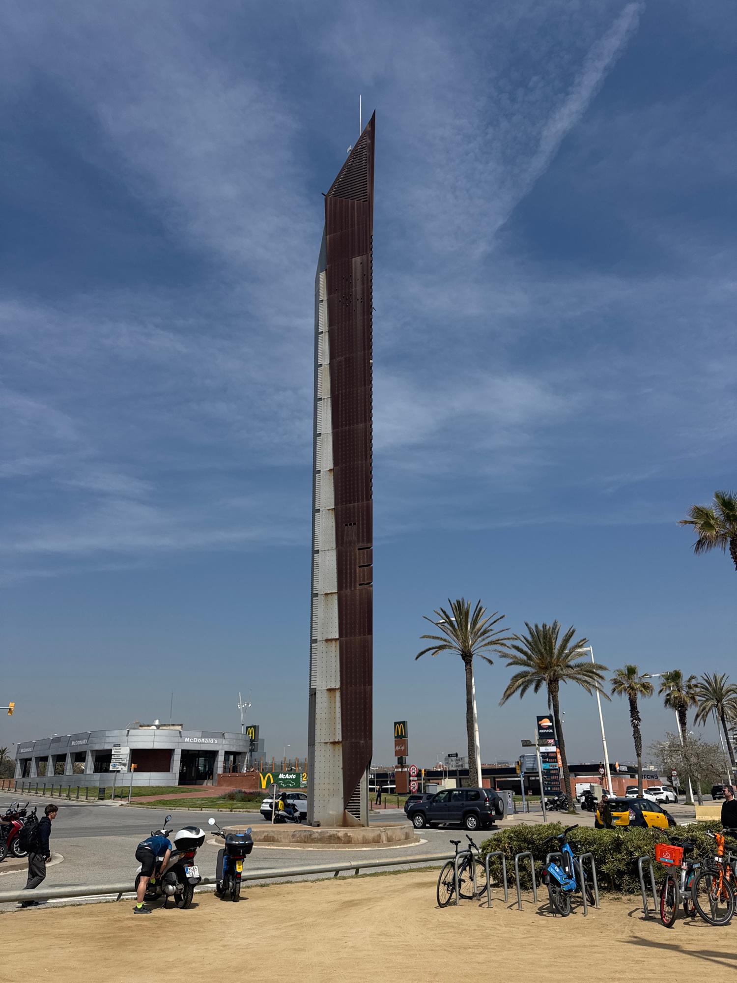 The image shows the Estela de Barcelona monument, a tall, modern sculpture on Barceloneta beach in Barcelona, Spain, under a blue sky with wispy clouds. A row of palm trees lines the right side of the…read more