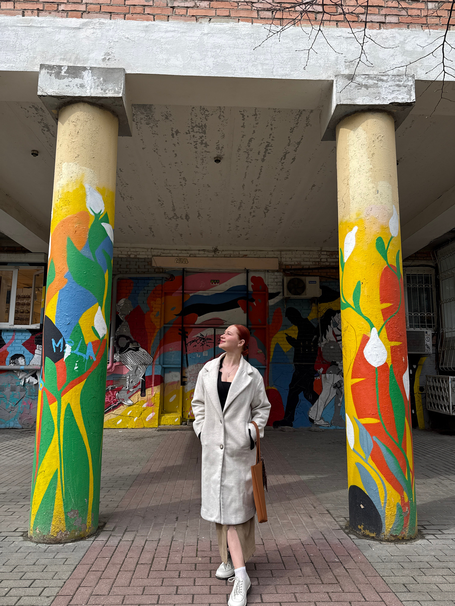 The image shows a woman standing on a brick walkway between two painted columns. The columns are part of a building's support structure. The walls behind the columns are covered in graffiti-style artwβ¦read more