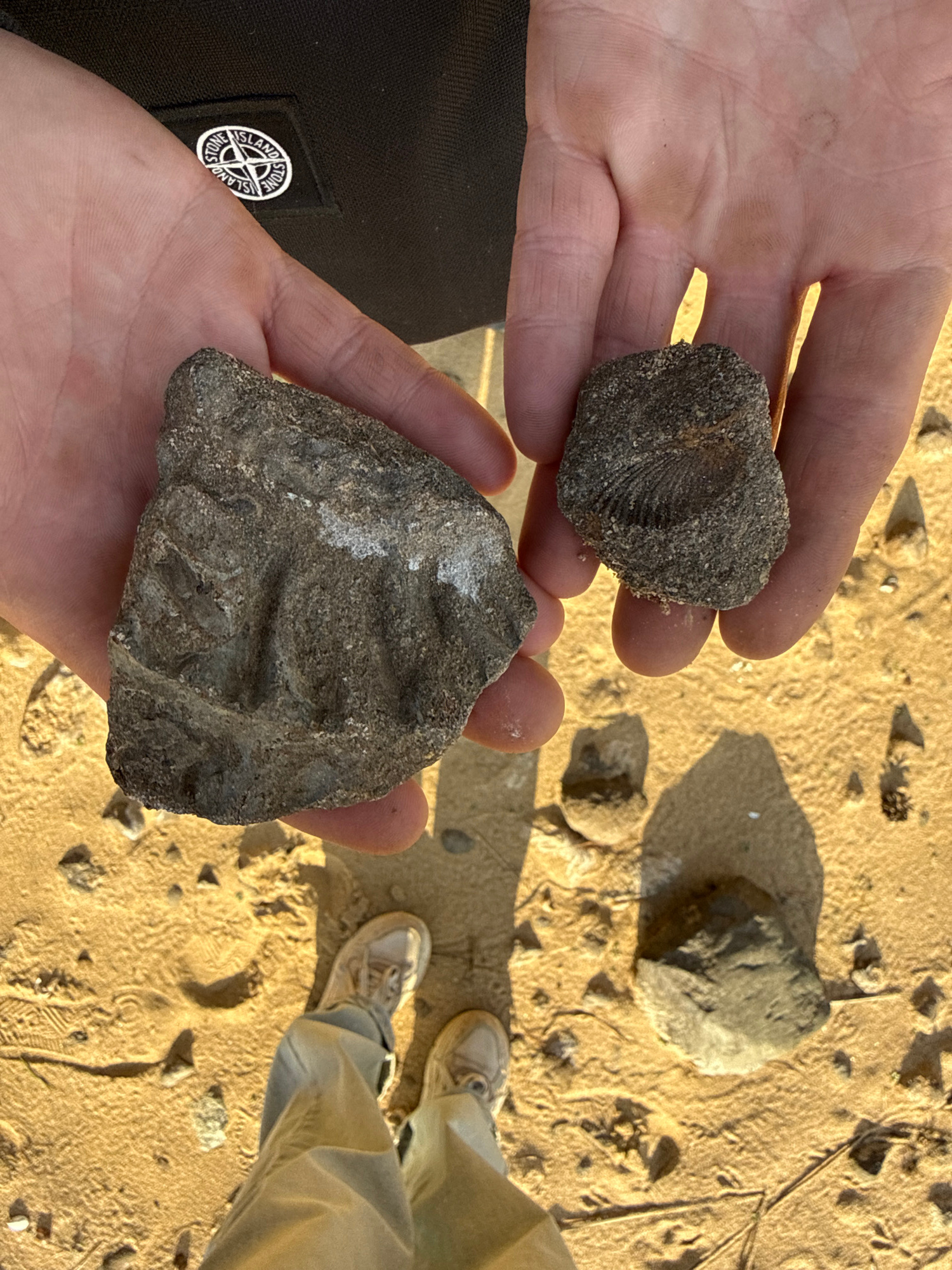 The image shows two hands holding stones. The hand on the left is holding a stone with a visible fossil, possibly of a coral. The hand on the right is holding a larger, irregularly shaped stone with f…read more