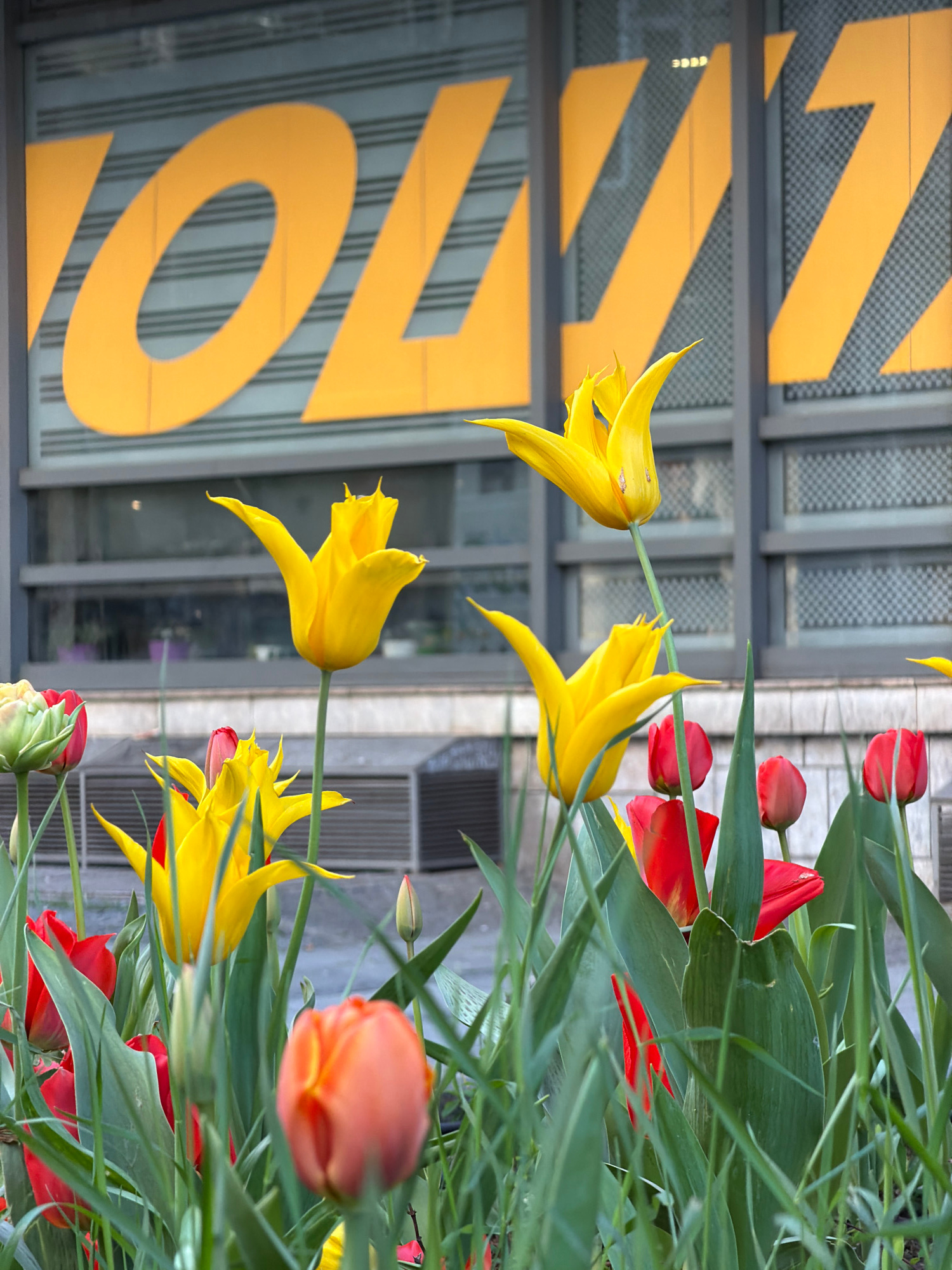 The image shows a close-up of yellow and red tulips in front of a building. The building has a yellow "ON" sign with a zig-zag pattern behind it. The location is Belgrade, Serbia. There are no people…read more