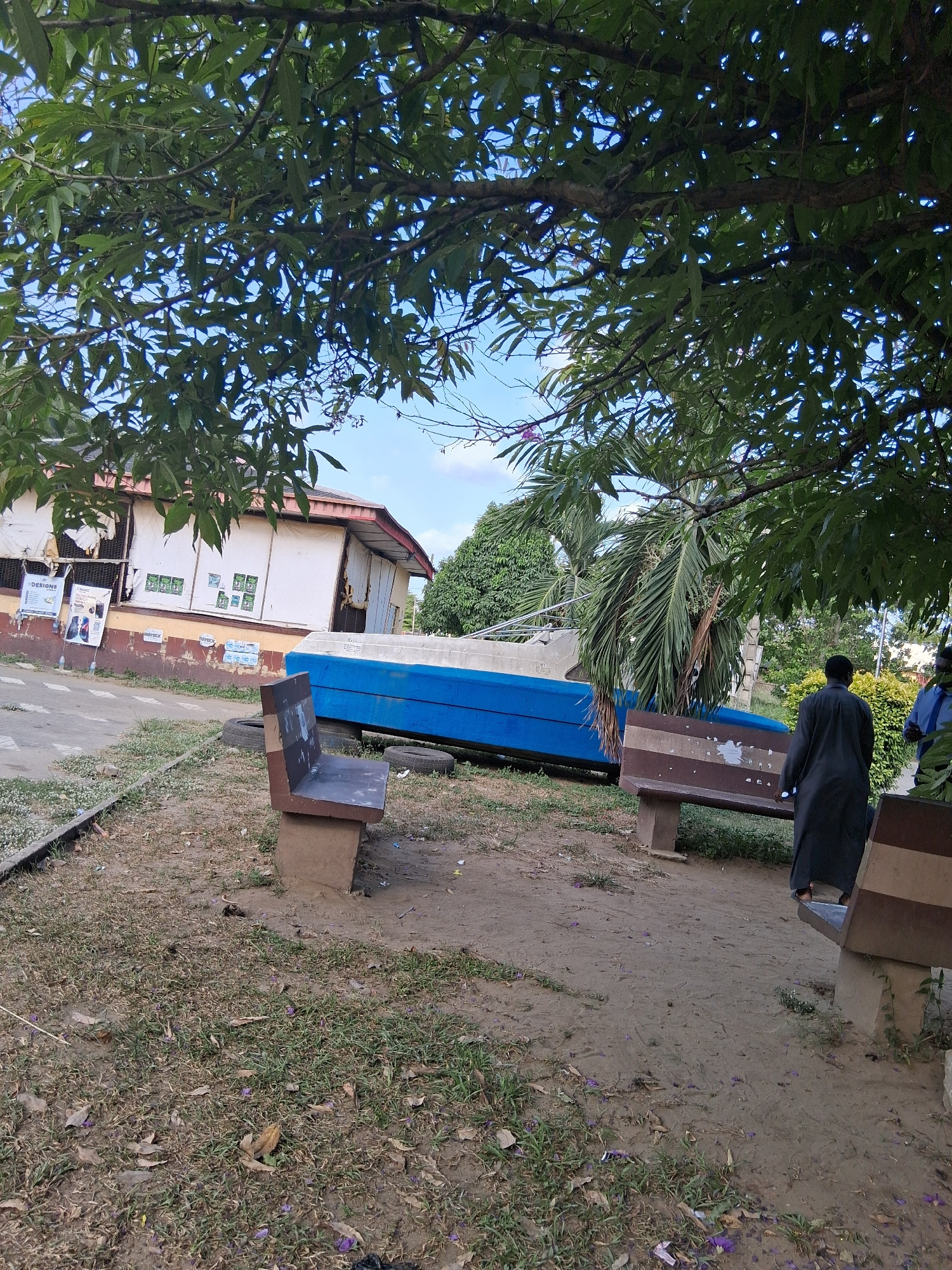 The image shows a park scene in Lagos, Nigeria. A man wearing a black robe stands near a park bench with brown and blue stripes. Next to the bench, on the ground, is a dark patch of what could be tire…read more