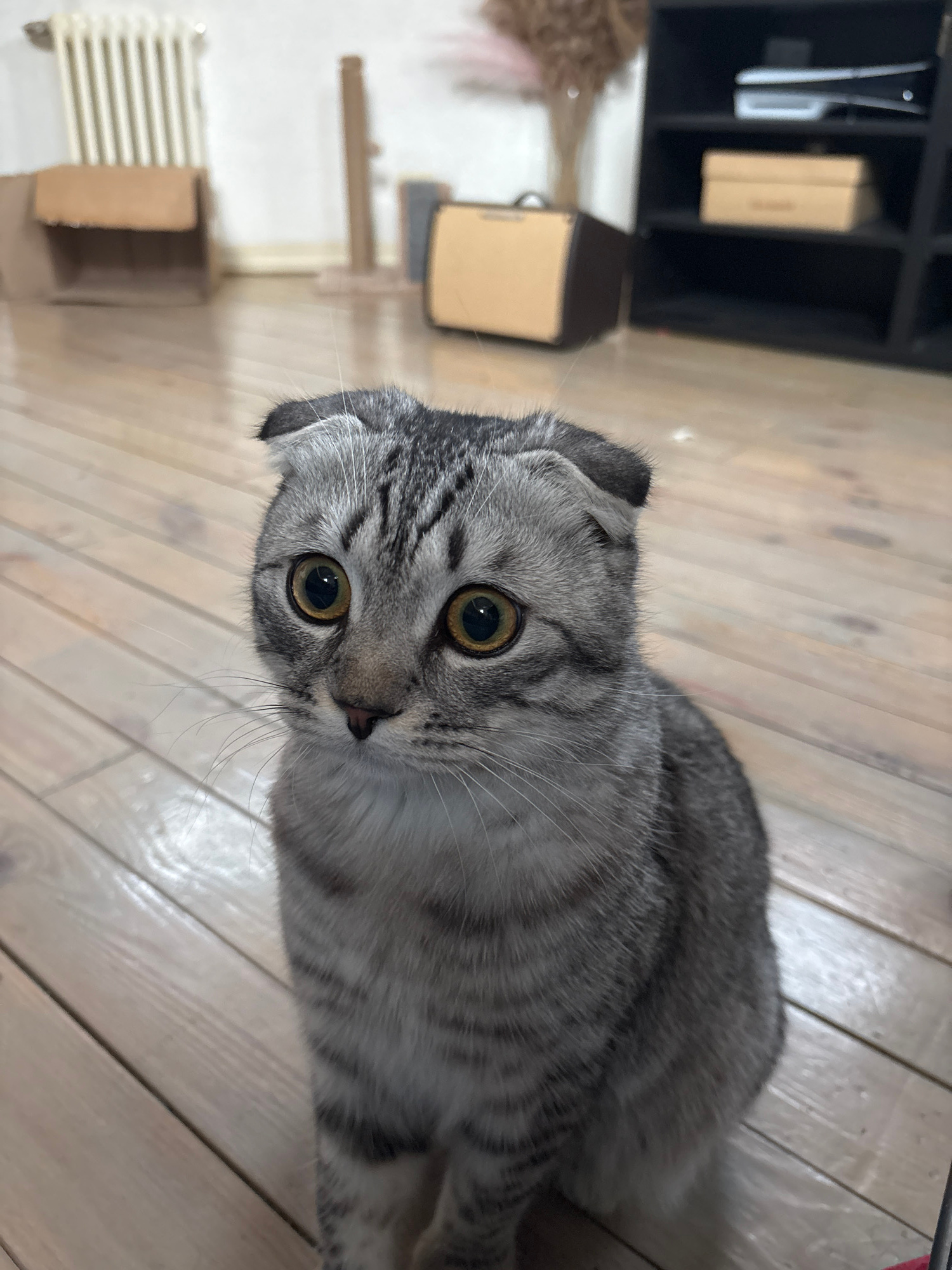 A gray tabby Scottish Fold cat is lying on a light-colored wooden floor. The cat is oriented towards the left side of the frame, with its head tilted upwards towards the camera. The cat has round, gol…read more