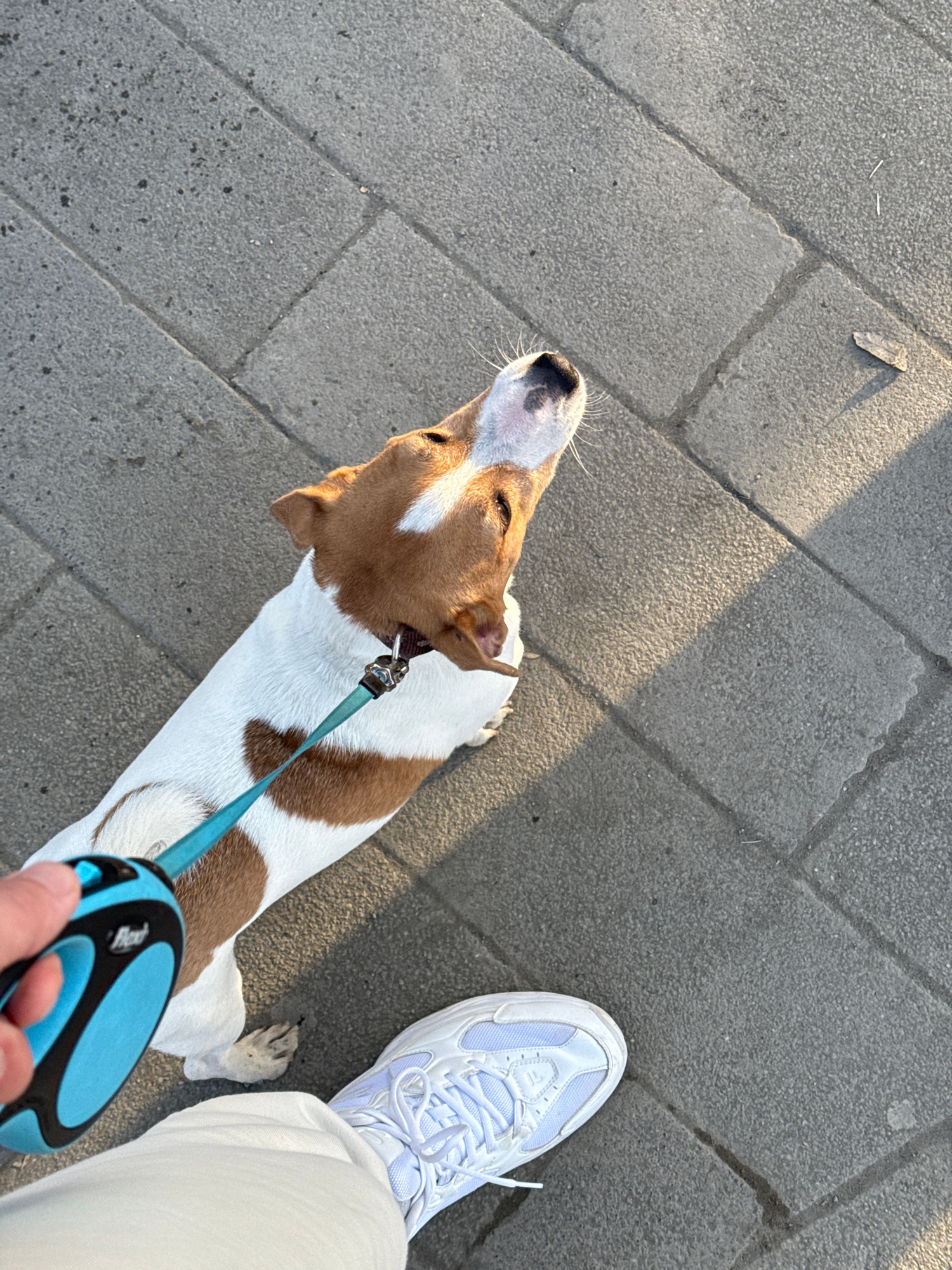 The image presents a top-down view of a scene on a paved surface, likely a sidewalk or pedestrian area. A Jack Russell Terrier-type dog with a white and brown coat is positioned on the left side of thβ¦read more