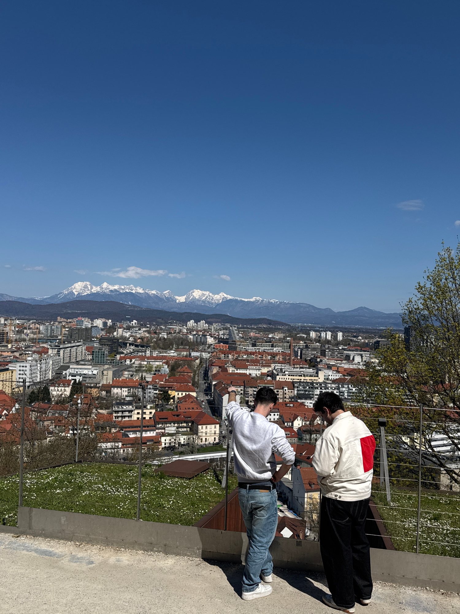 The image displays an outdoor, high-angle panoramic view of Ljubljana, Slovenia, observed from an elevated position consistent with Ljubljana Castle. In the foreground, two male individuals stand with…read more