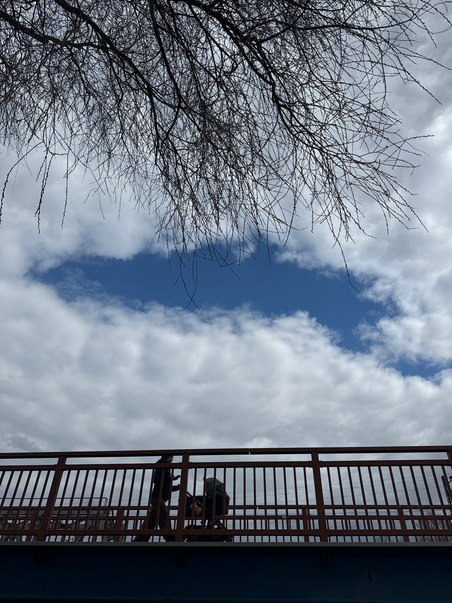 The image, taken from a low angle, shows a view towards the sky in Carnikava, Latvia. Dominating the left side is a bare tree with intricate branches reaching into the sky. The sky is filled with clou…read more