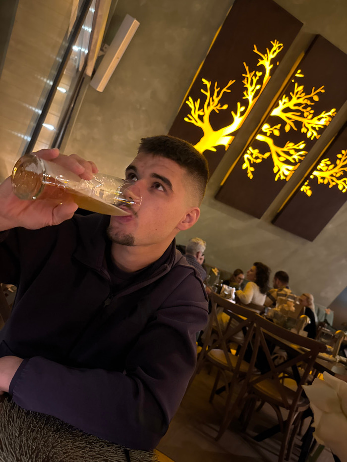 An indoor scene in a restaurant or bar in Căciulați, Romania, features a young adult male in the foreground, actively drinking from a clear glass filled with a light amber liquid. The male has short d…read more