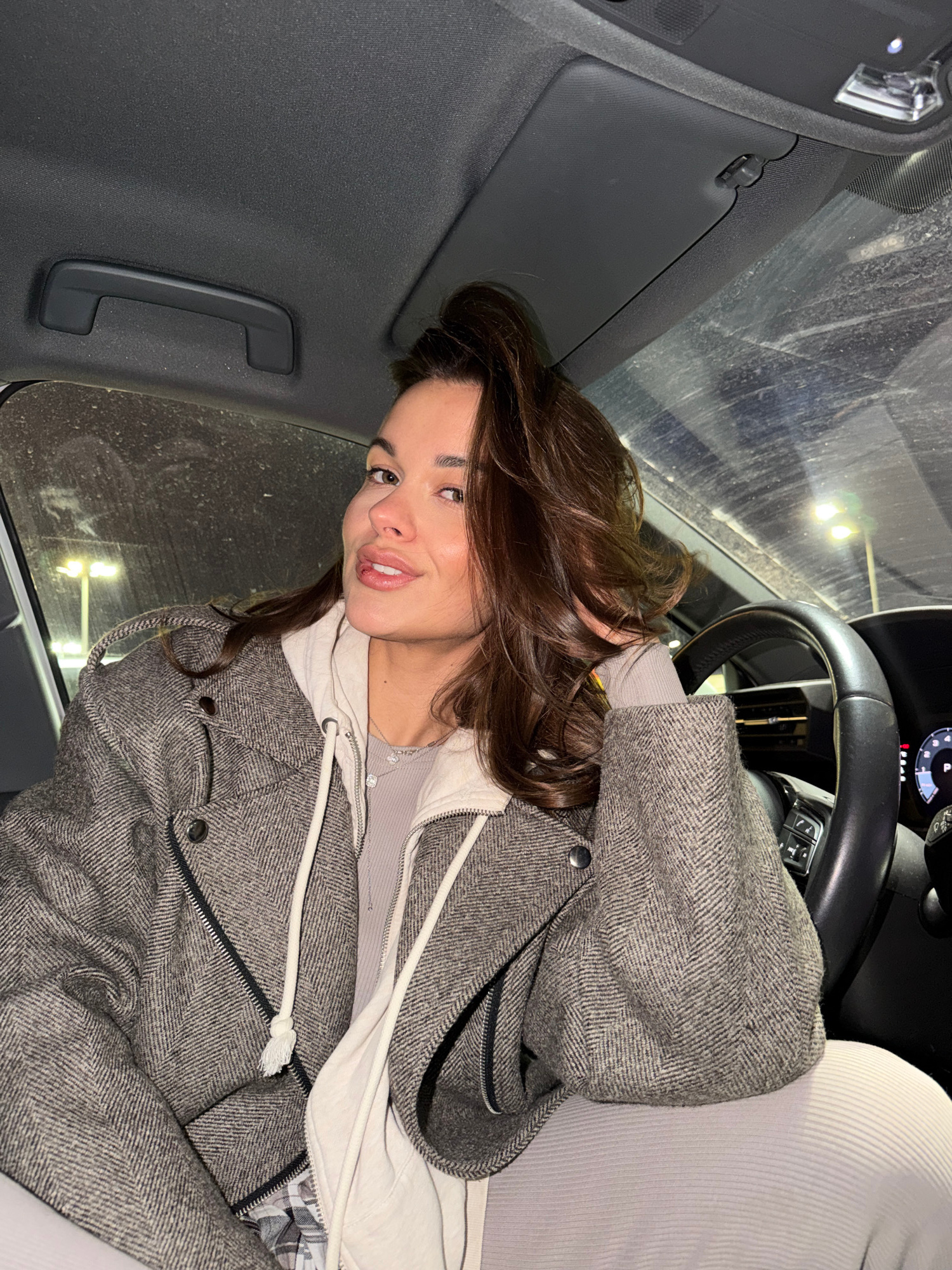 The image captures a young woman posing inside a car, likely in Krasnoyarsk, Russia, at night. She has long, wavy brown hair and is looking towards the viewer with a soft smile. Her left hand is casua…read more